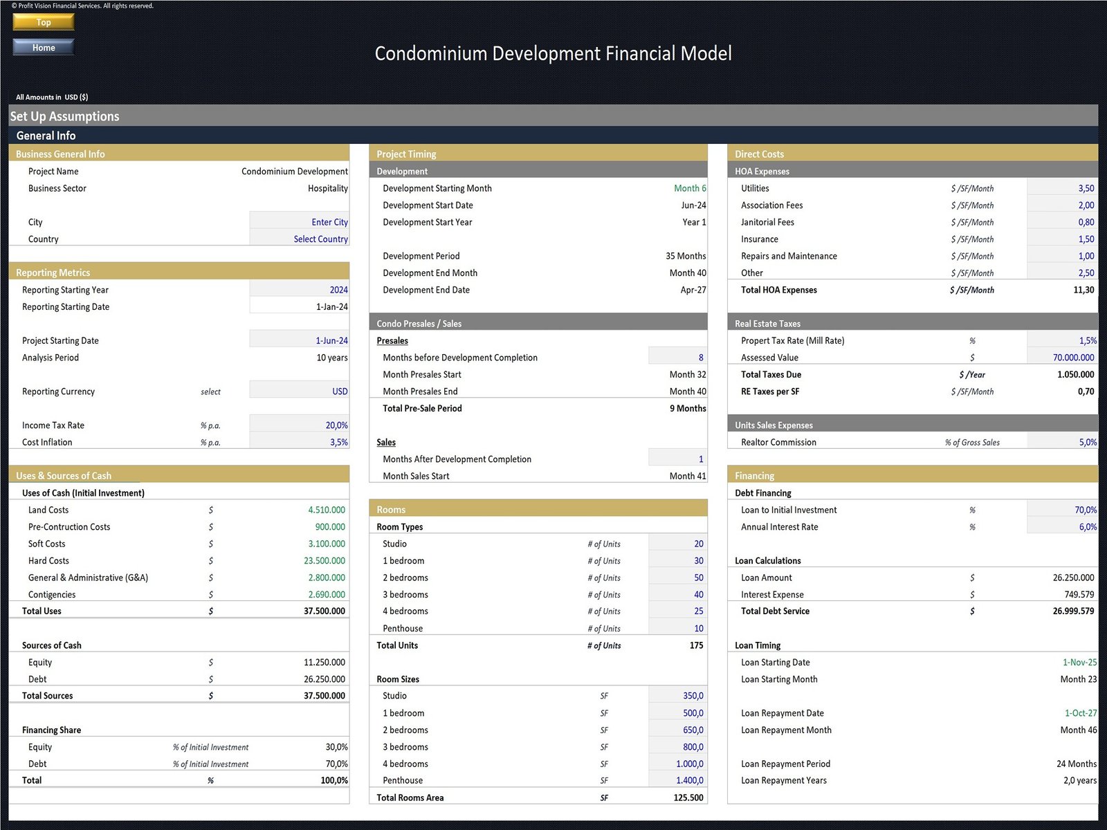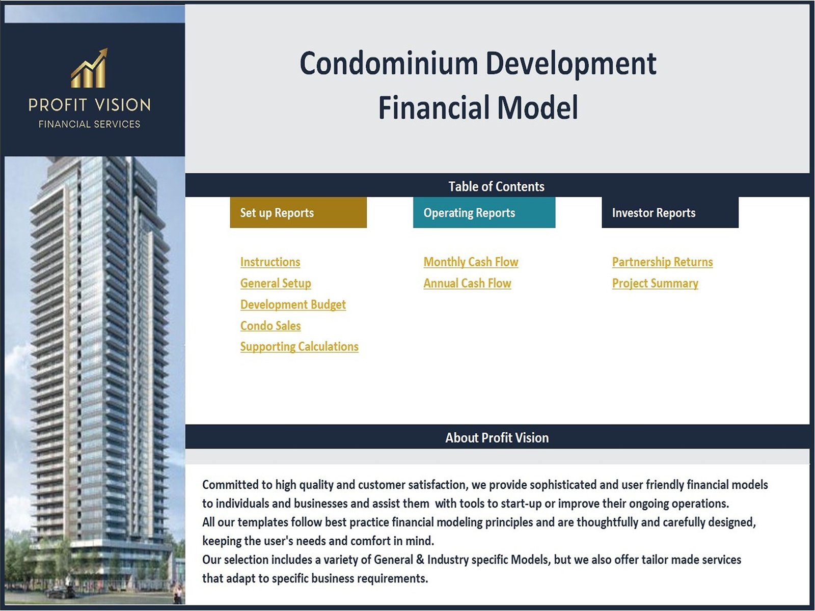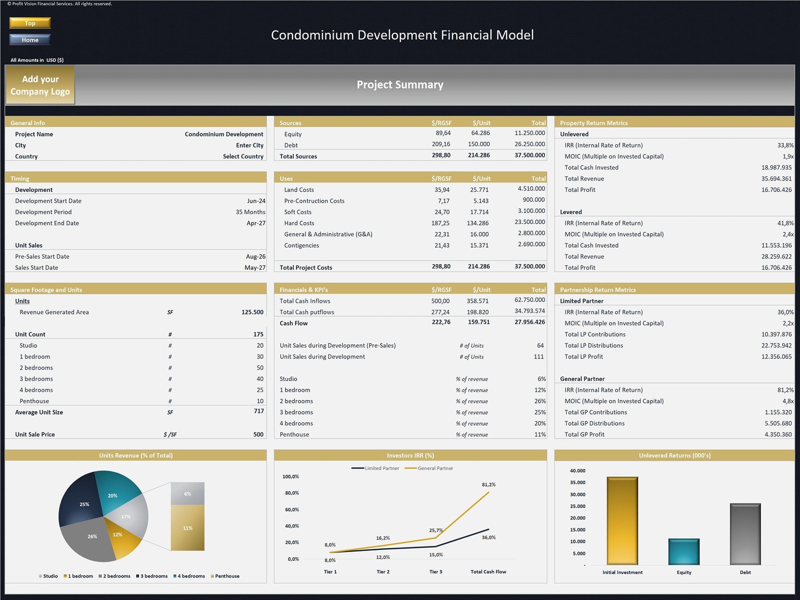 A condominium (or condo for short) is a building structure divided into several units that are each separately owned, surrounded by common areas that are jointly owned. Unlike apartments that are leased by their tenants, condominium units are owned outright. Additionally, the owners of the individual units also collectively own the common areas of the property, such as corridors/hallways, walkways, laundry rooms, etc., as well as common utilities and amenities. Condominium Development – 10 Year Financial Model presents a development scenario of a Condominium Building with units available for Sale and enables users to get into details of every step of a Condominium building project, from the construction stage to sales of Units, projection of cash flows, and returns to investors.