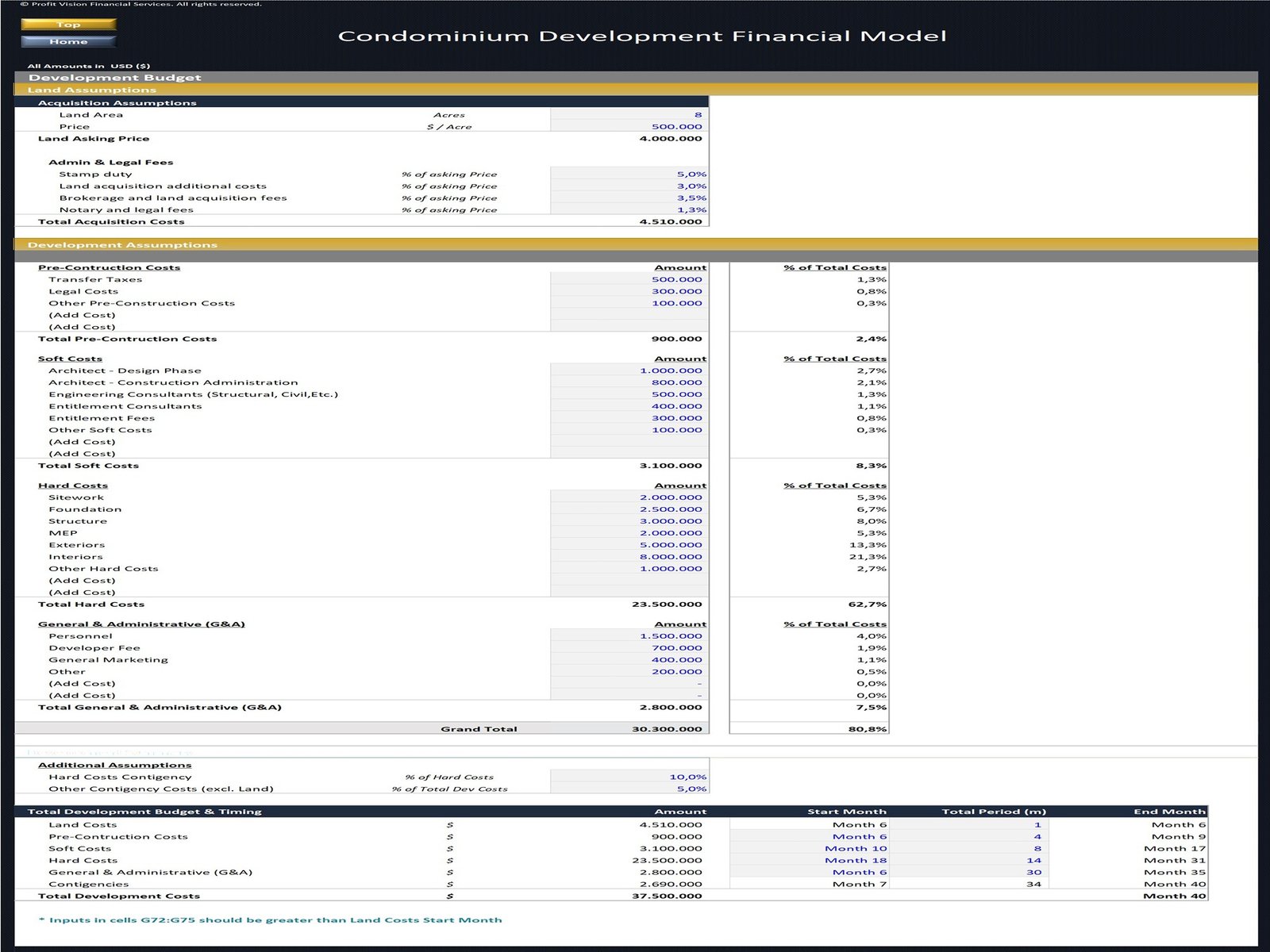 - Timing and Cost Assumptions for the construction period (Land Purchase, Hard & Soft costs, G&A, etc)