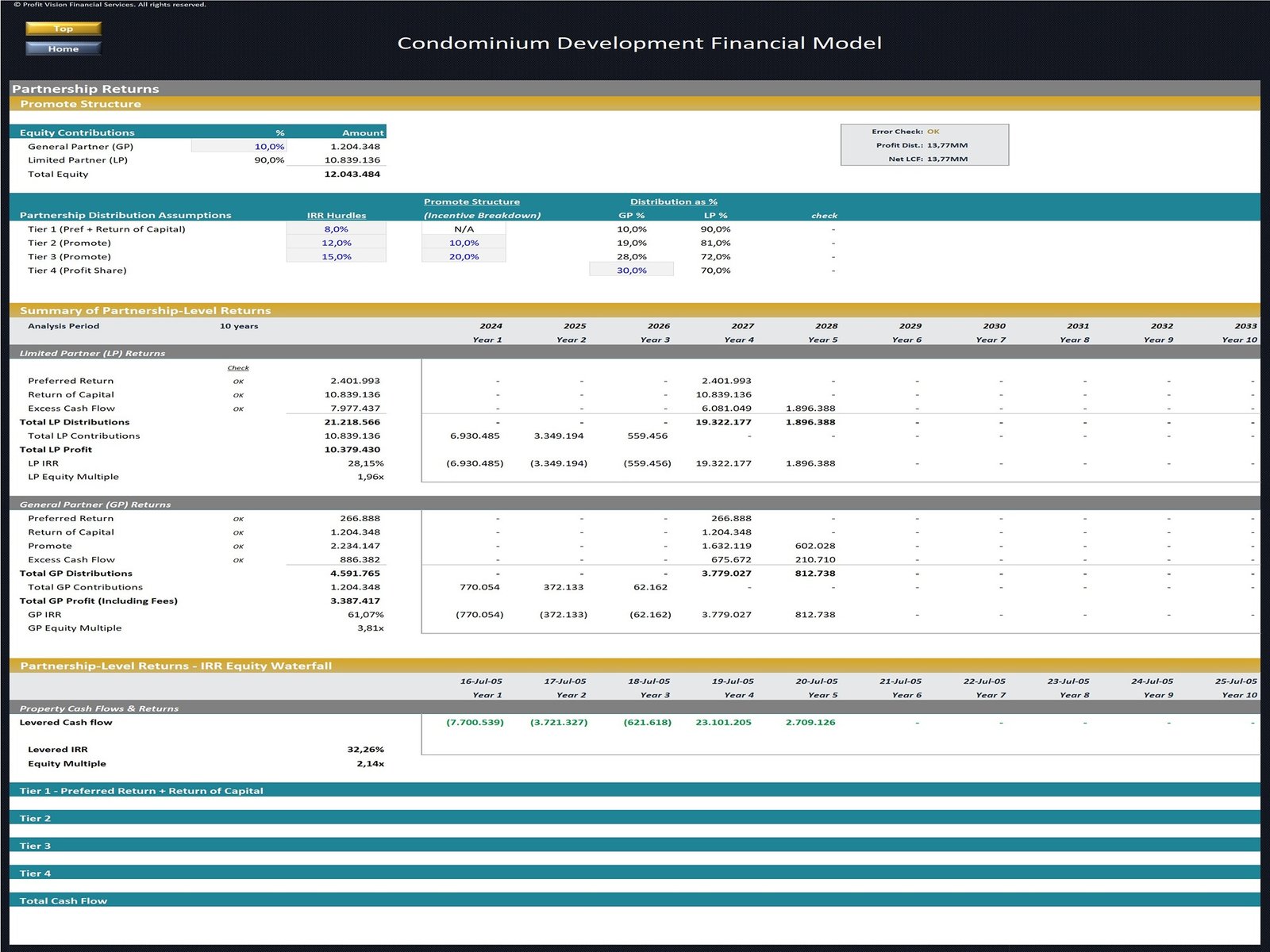 - A 4-tier IRR hurdle waterfall model to distribute proceeds between the general partner and limited partner.