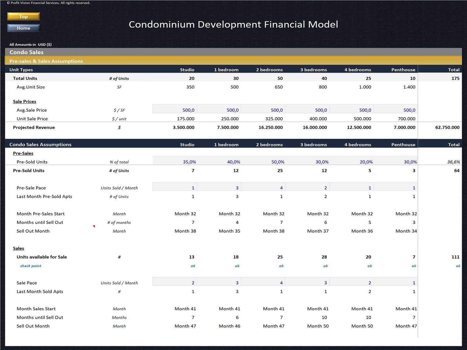 - Assumptions for the Pre-Sale and Sale of Condo Units including Avg. Units Sale price and Pre-sales and Sales Metrics per Unit Type