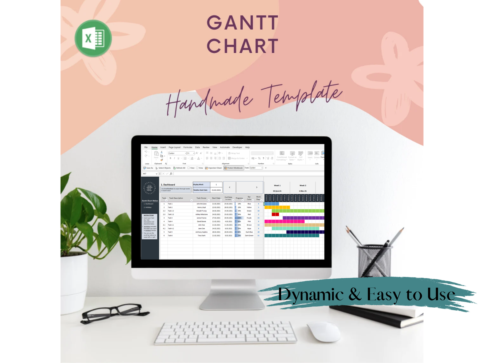 Dynamic Gantt Chart Excel Template for Team Work Management | Easy Database Entry & Tracking | Visual Project Planning Tool