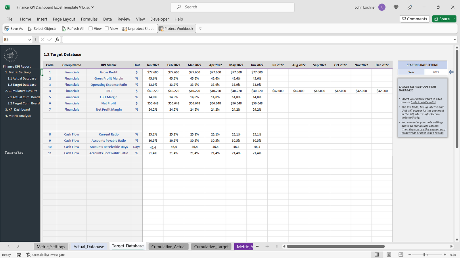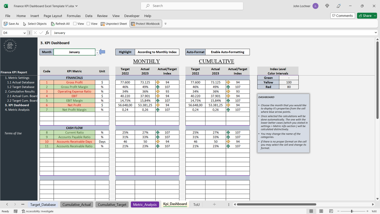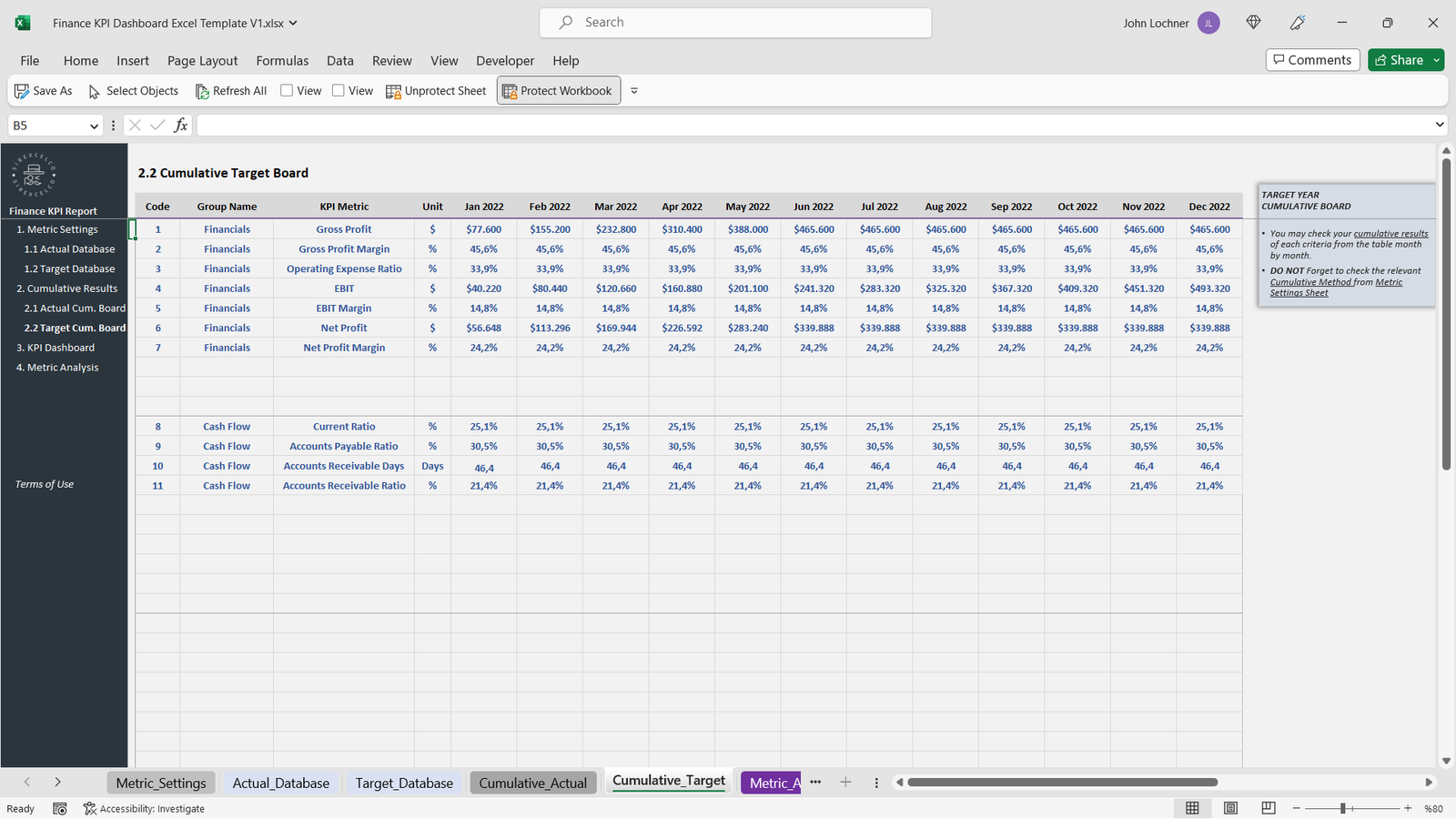 Monthly and Cumulative KPI Tracking: Monitor your financial performance month by month and evaluate cumulative results to identify trends and measure long-term progress.
