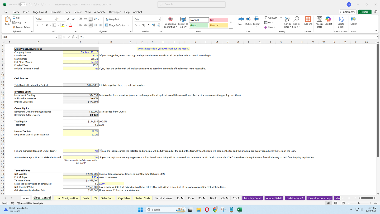 - Allows users to define an exit month and exit multiple based on loans receivable.