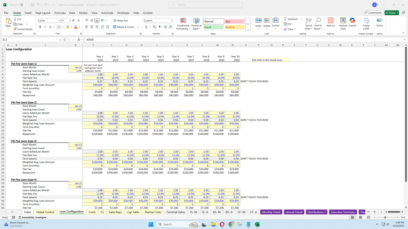 - Models up to four loan types with customizable starting counts, origination rates, flat fees, loan amounts, and terms.