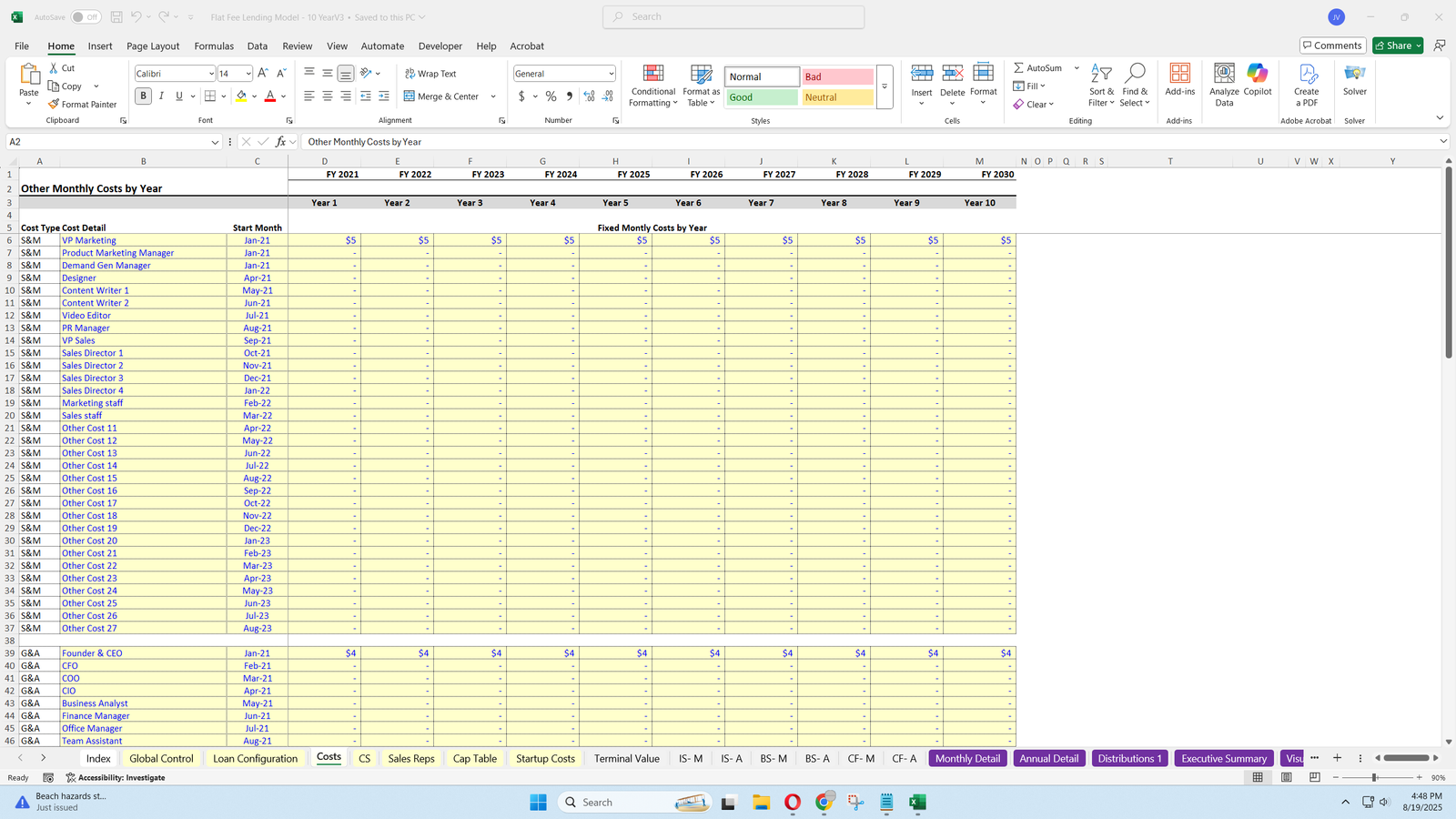 - Models customer service and sales rep costs based on loan volume.