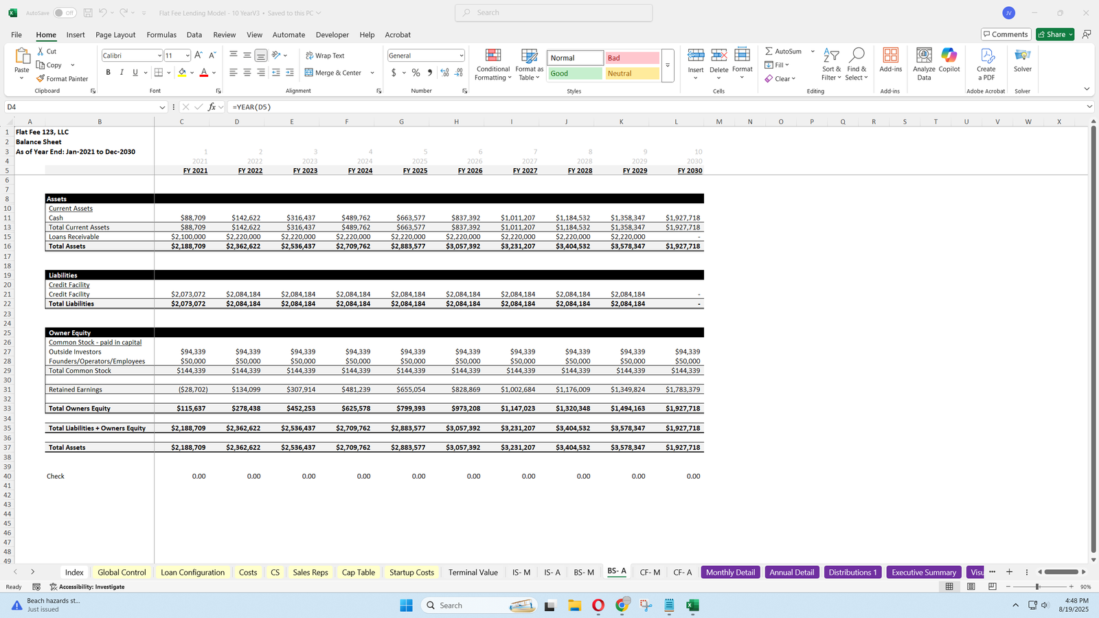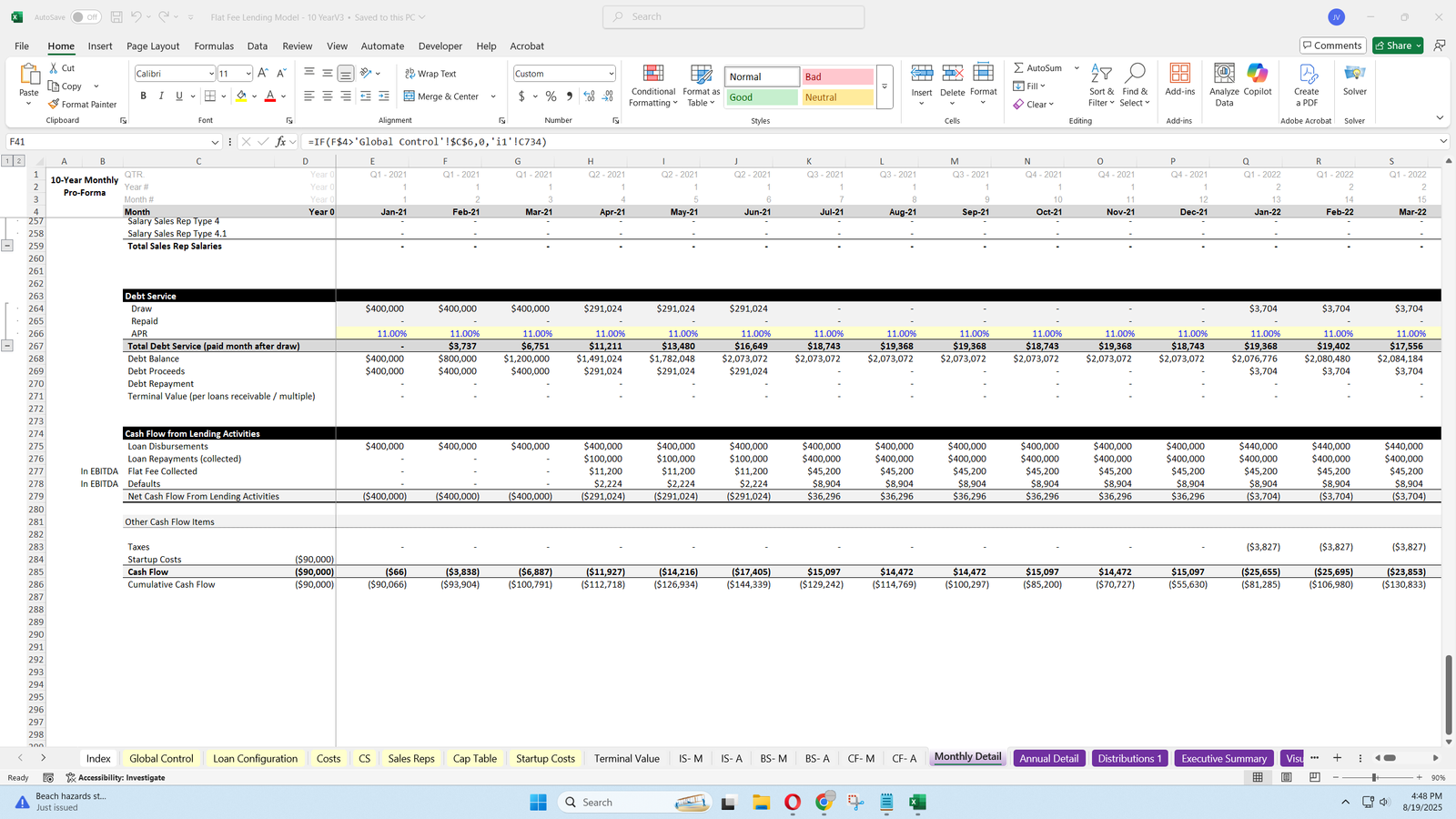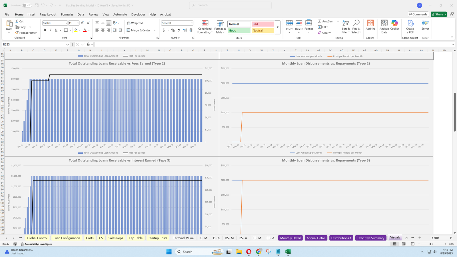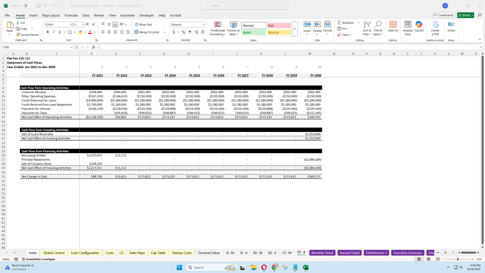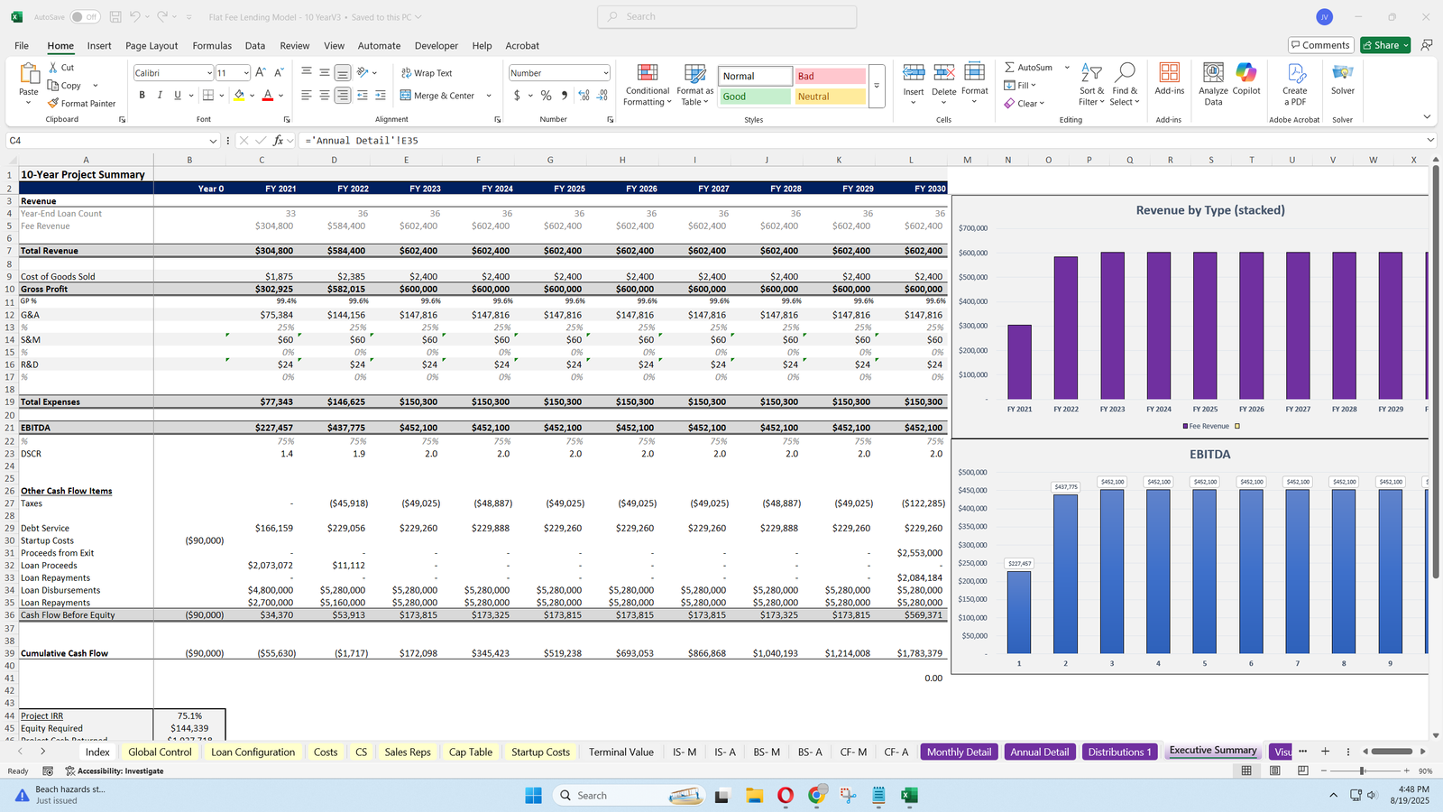 - This model provides a detailed framework for projecting loan origination and repayment, revenue from flat fees, and comprehensive expense tracking, including operating expenses, customer service, sales rep costs, and credit facility interest.