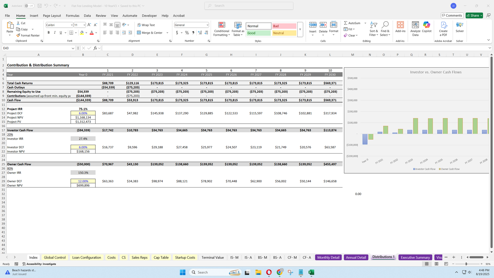- Models equity contributions from investors and owners, with customizable ownership percentages.