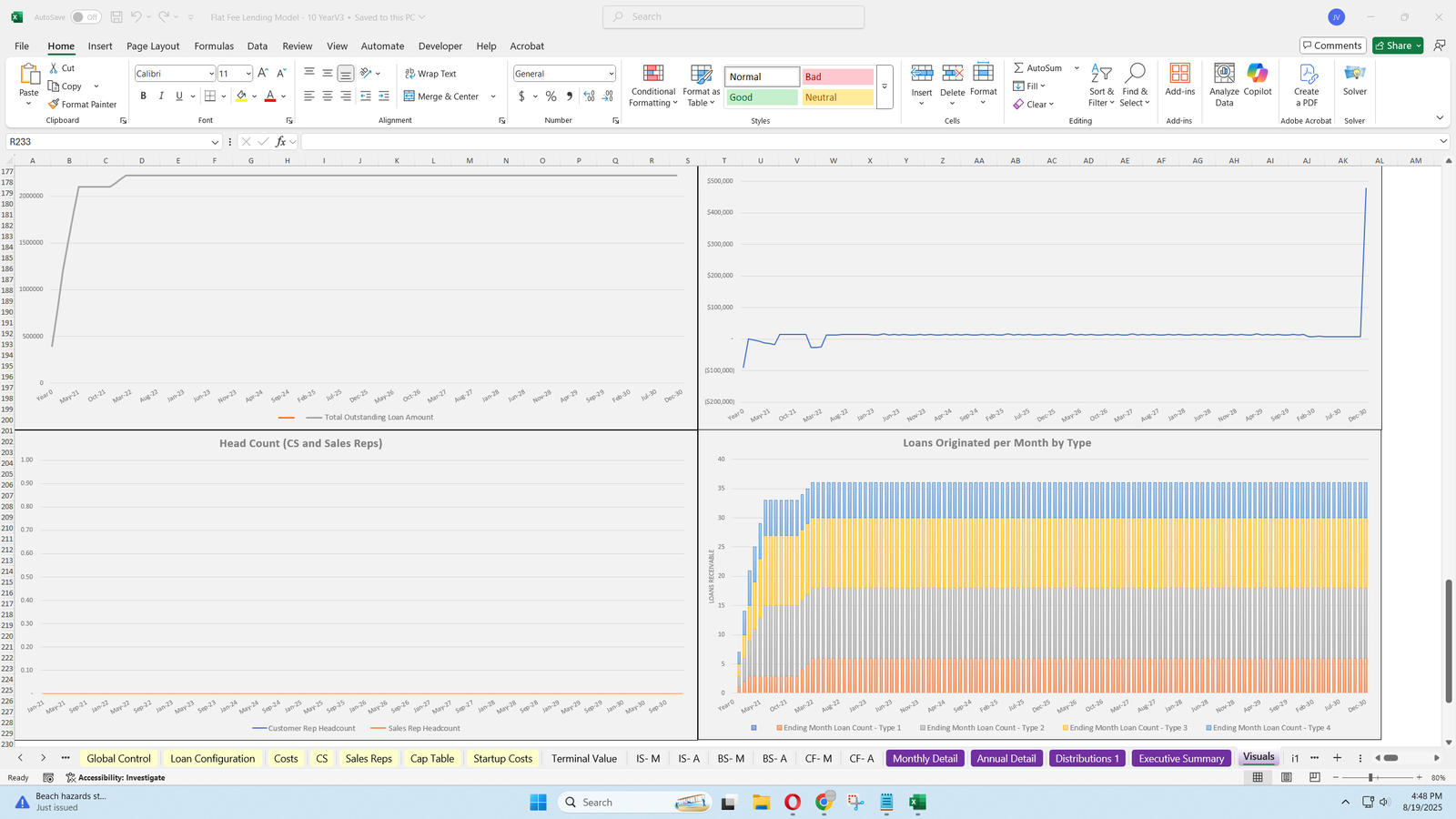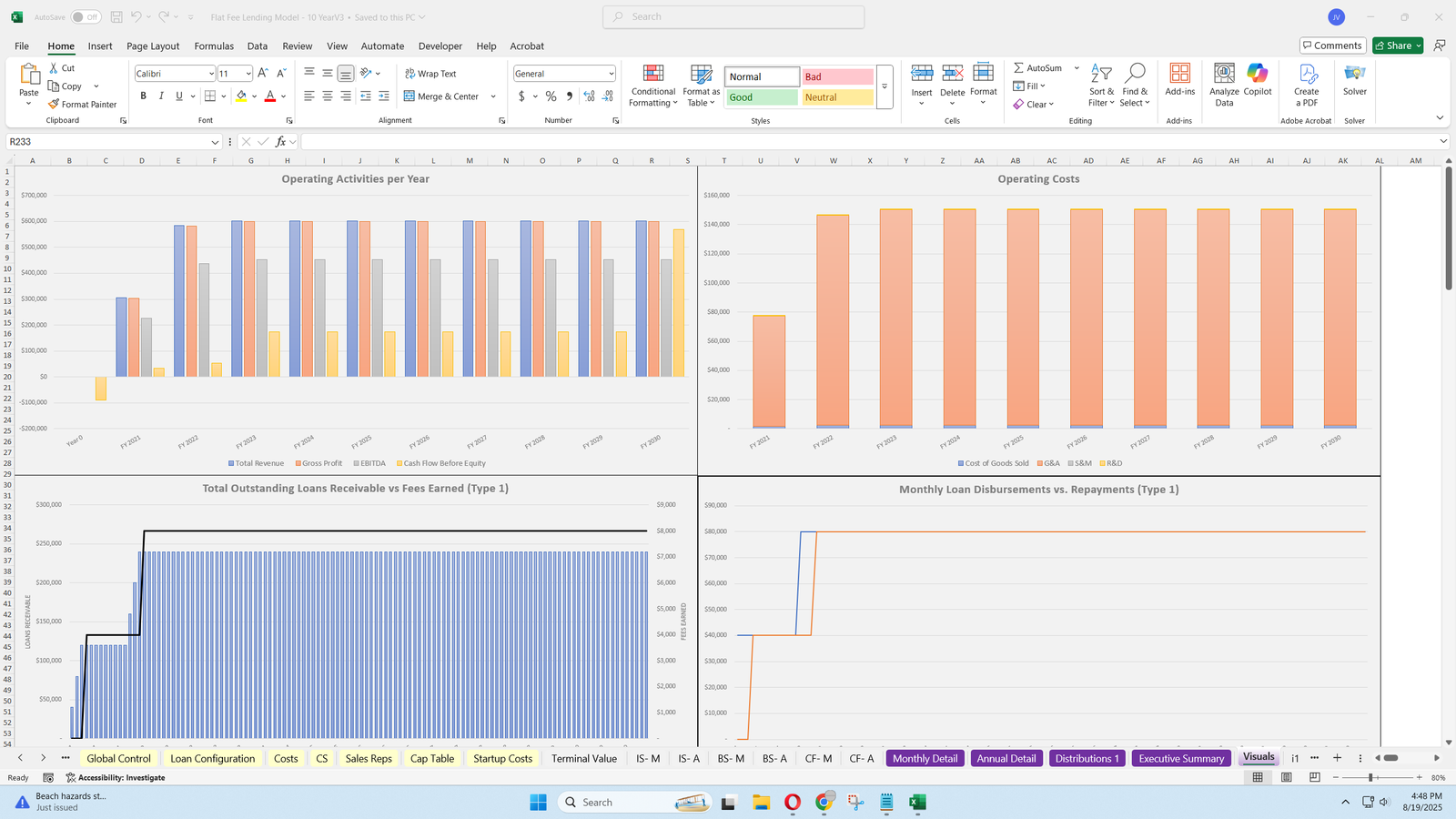 Generates charts illustrating operating activities, costs, loan activity, cash flow, and headcount.