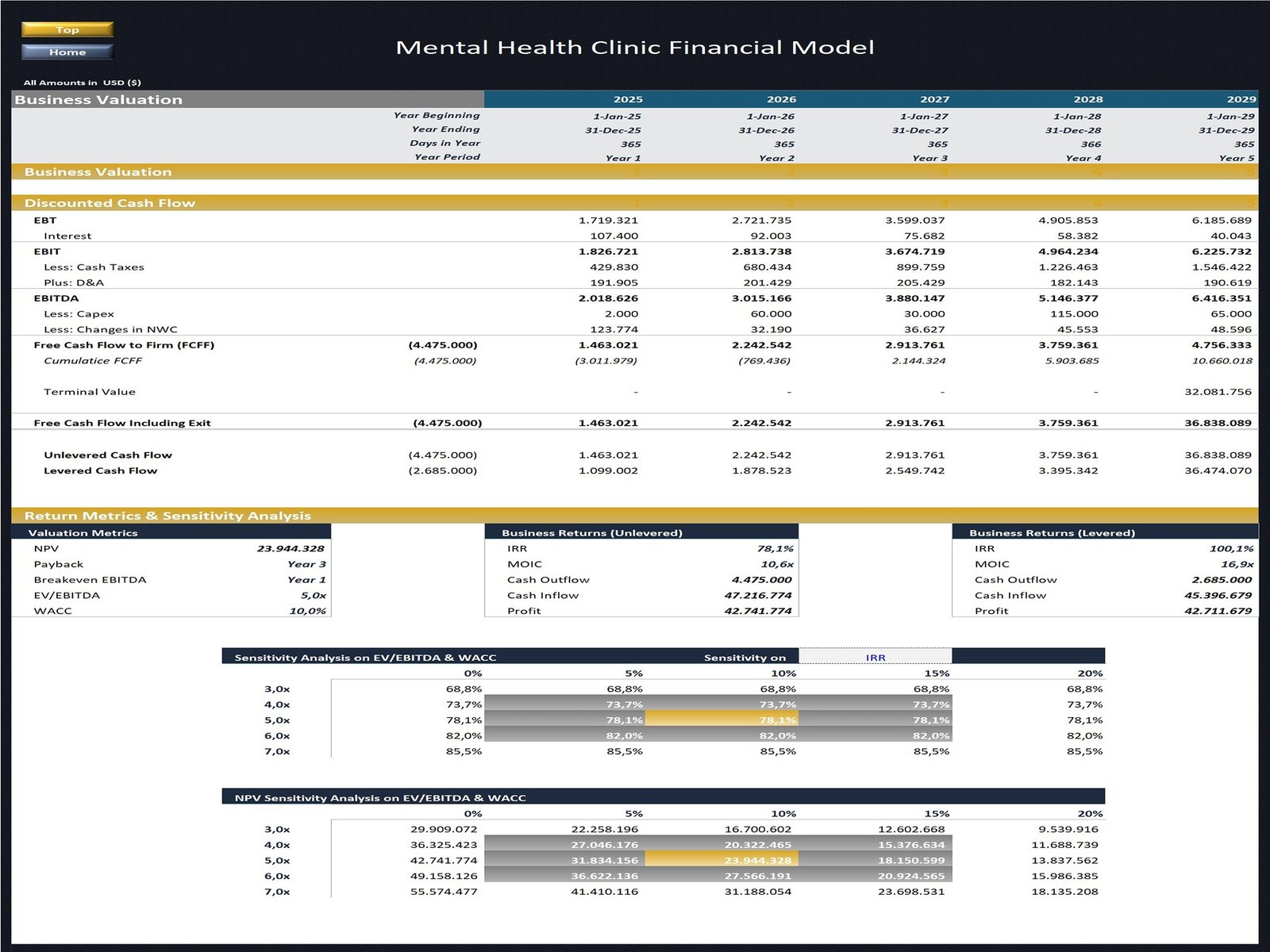 - Business Valuation, including DCF Model, Return Metrics (NPV, EV, IRR, MOIC, ROI, etc.), and Sensitivity Analysis