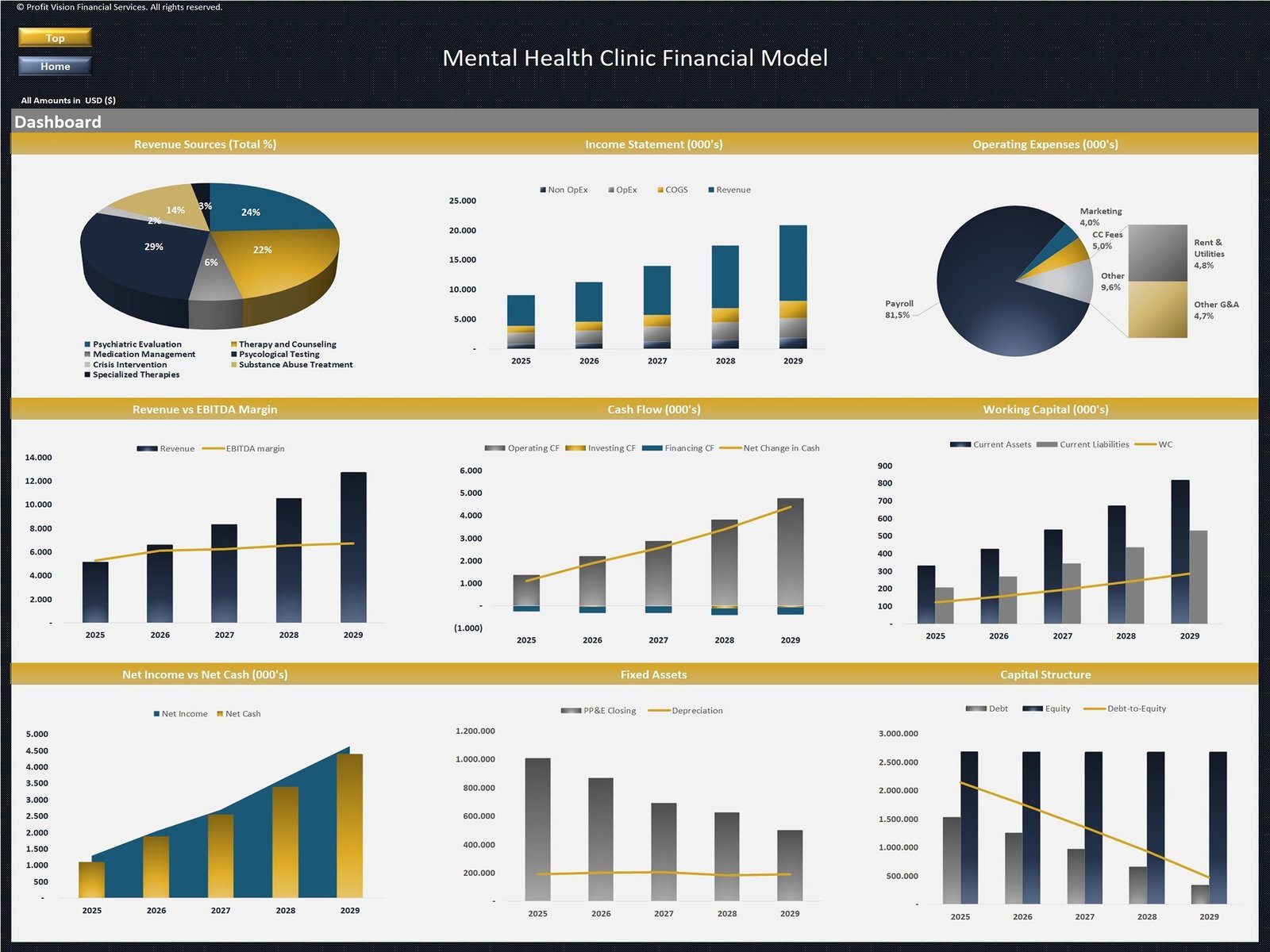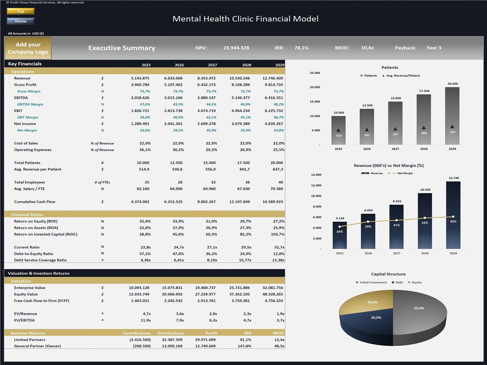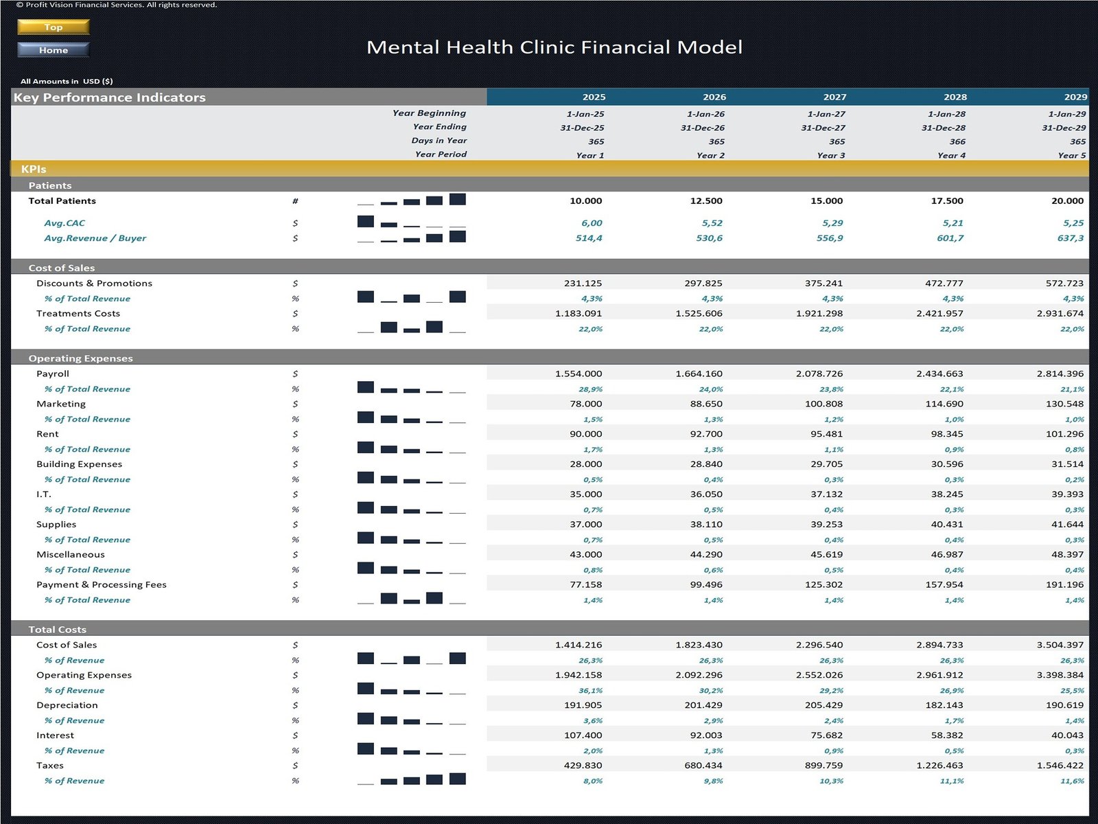 This Financial Model presents a business scenario of a Mental Health Clinic offering a variety of treatments (Psychiatric Evaluation, Therapy and Counseling, Crisis Intervention, etc.) and is a flexible tool for business owners to forecast their financial and operational activities. It includes assumptions for up to 10 different Treatment Categories, Treatment Fees and Cost of Sales, Patients Assumptions, Payroll, Operating Expenses, Fixed Assets & Depreciation, Financing through Debt & Equity and Exit Valuation assumptions in case of a potential sale of the business.