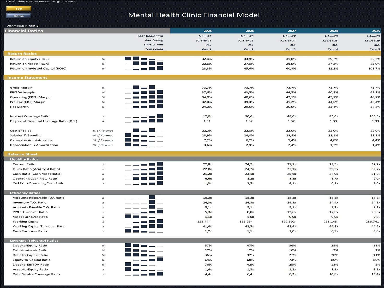- KPIs & Financial Ratios, including several Profitability, Efficiency, Liquidity, and Leverage (Solvency) Ratios