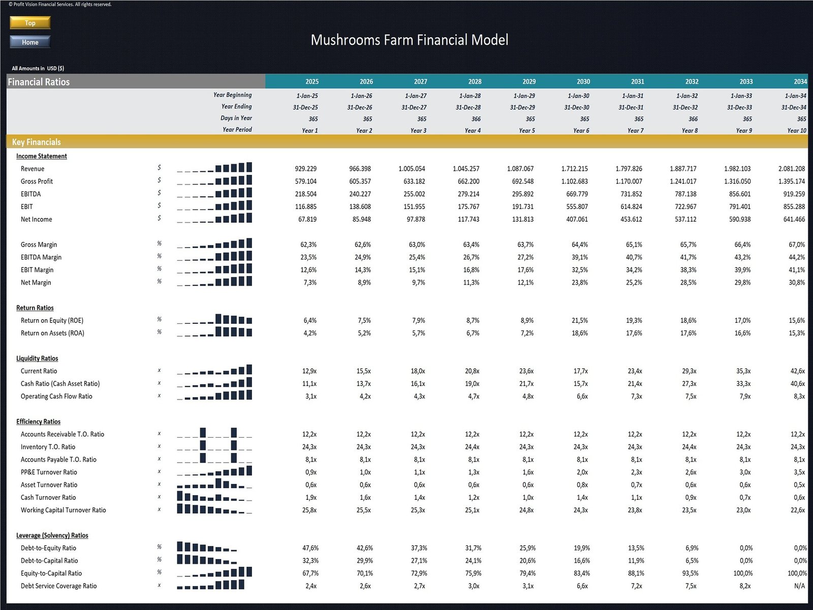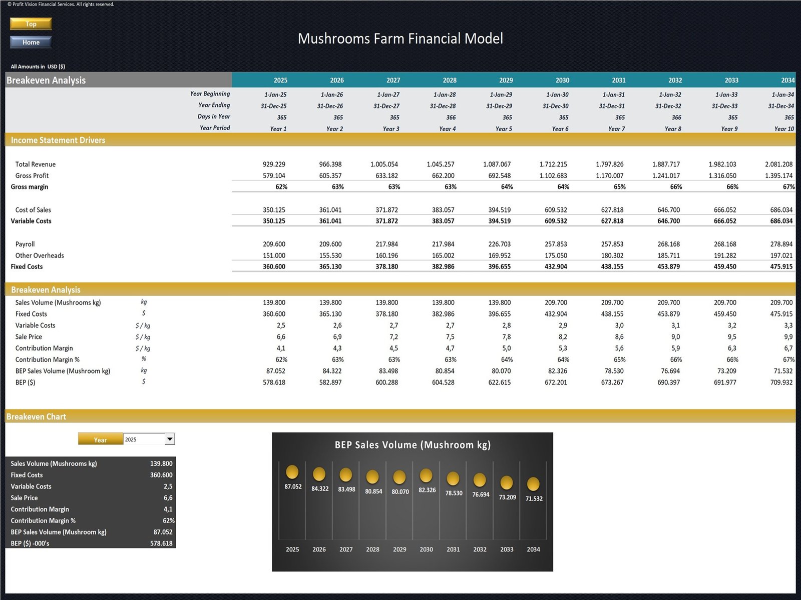 This 10-Year Mushroom Farm Financial Model is a comprehensive financial planning tool designed to project the profitability of a mushroom cultivation business. With a structured financial forecast including revenue and expenses projections and important financial metrics, the model aids investors and farm operators in strategic decision-making, securing funding, and optimizing long-term growth.