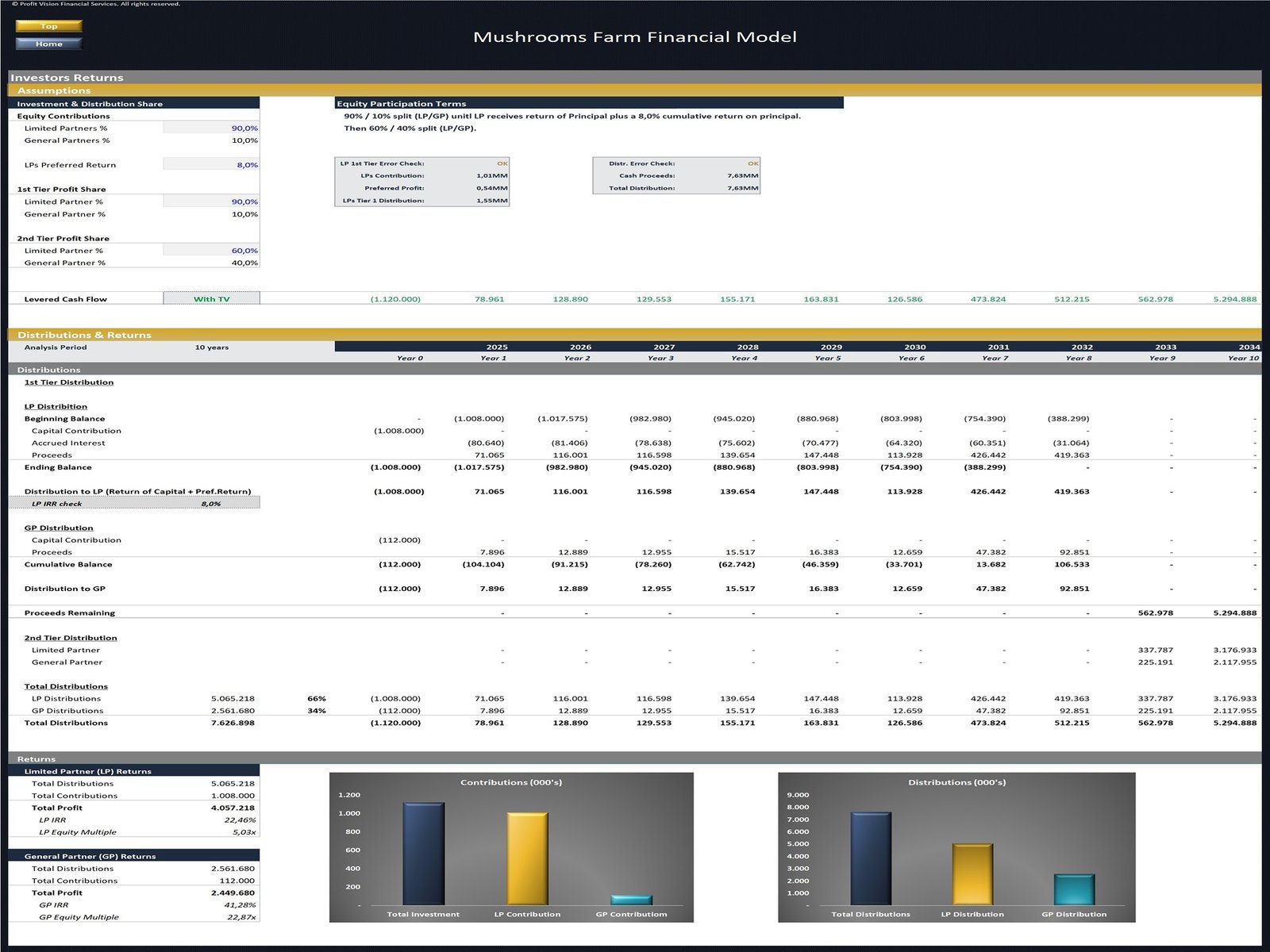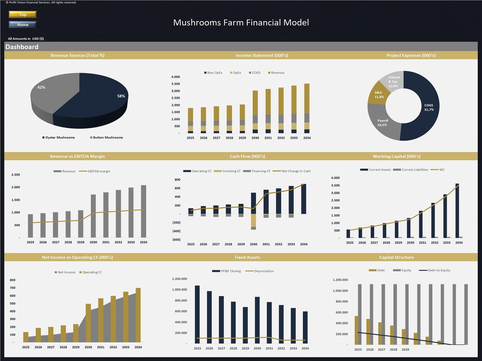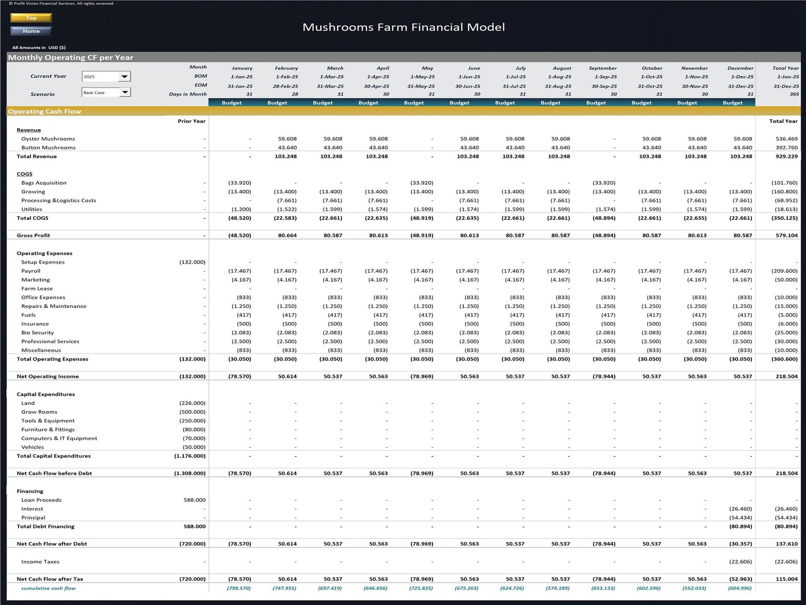 The model includes calculations and assumptions for the Farm Development (Land Acquisition or Lease, Construction Costs, Equipment, etc), Startup Expenses, Farm Production Assumptions (Production Schedule, Grow Rooms, Planting, Harvesting, Substrate Bags, etc.), Revenue from sales of Oyster and Button packets (4 different packet sizes), Direct Costs (Growing, Substrate Bags, Processing & Logistics, Utilities), Payroll, Operating Expenses, Fixed Assets & Depreciation, Financing through Debt & Equity and Exit Valuation assumptions (WACC and Terminal Value) in case of a potential sale of the business.