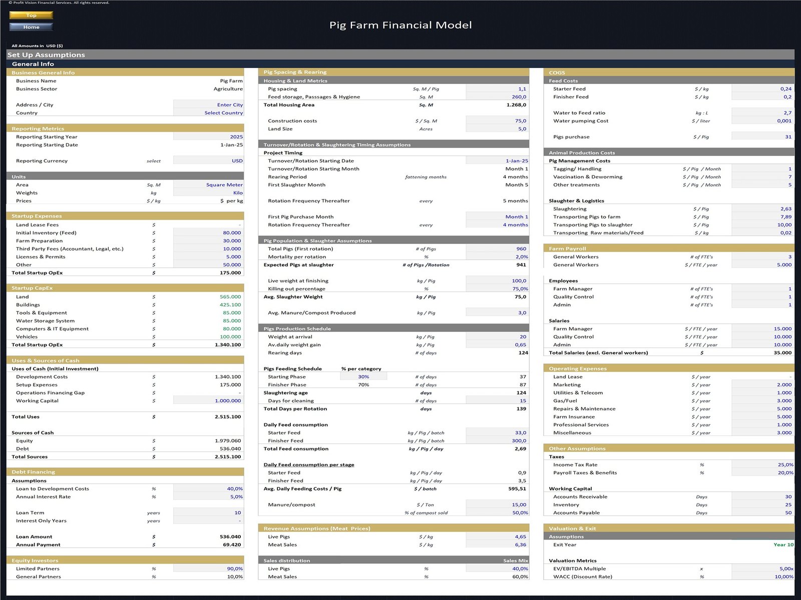 The model includes calculations and assumptions for the Farm Development (Land Acquisition or Lease, Construction Costs, Equipment, etc), Startup Expenses, Pig Population & Slaughter Assumptions (Number of Batches, Pigs per Batch, Mortality Rate, Weight), Pigs Feeding Schedule, Revenue from Live Pigs, Meat, and Manure/Compost Sales, Direct Costs (Feeding, Pig Treatment, Slaughter, Logistics, etc.), Payroll, Operating Expenses, Fixed Assets & Depreciation, Financing through Debt & Equity and Exit Valuation assumptions (WACC and Terminal Value) in case of a potential sale of the business.
