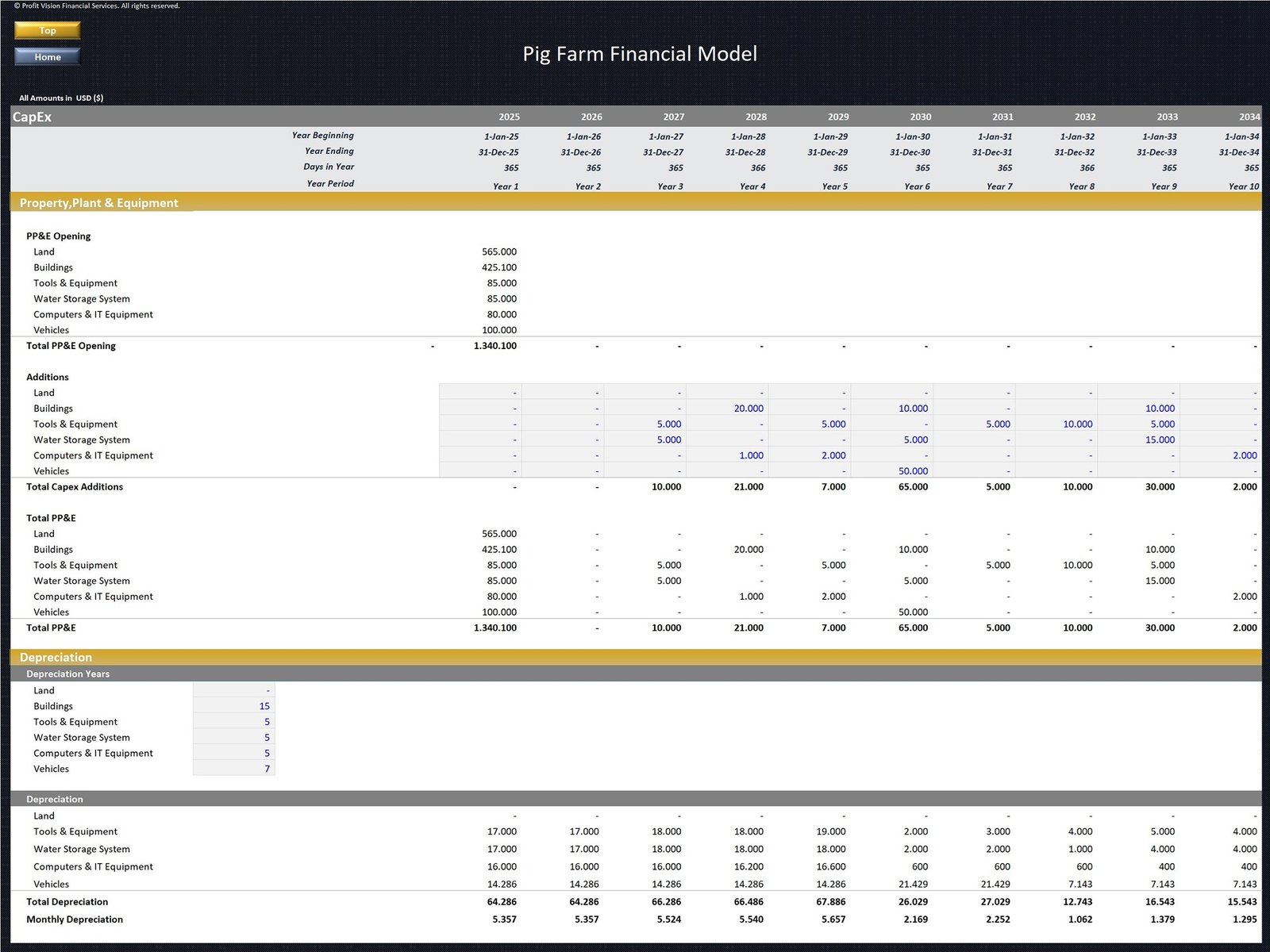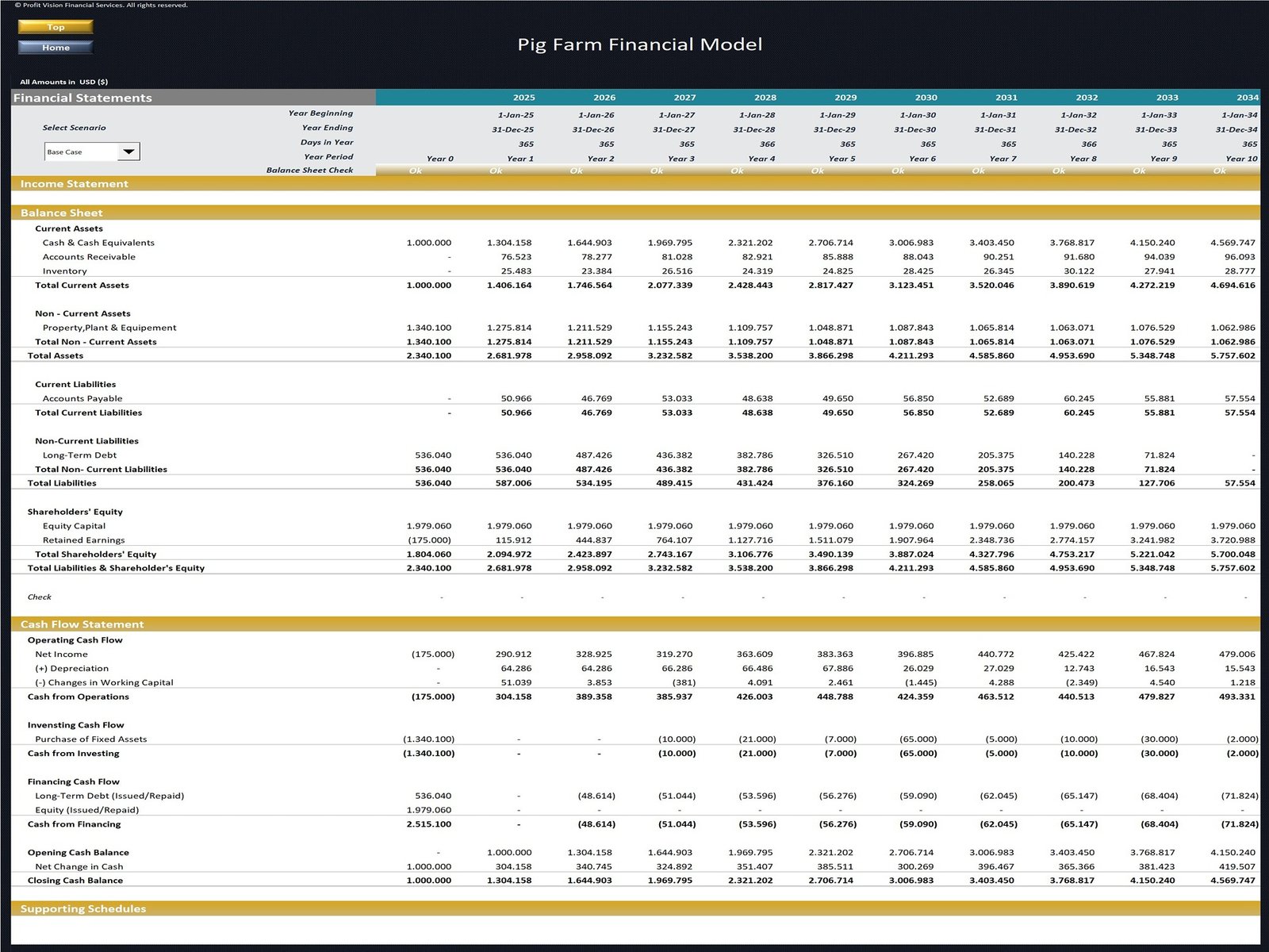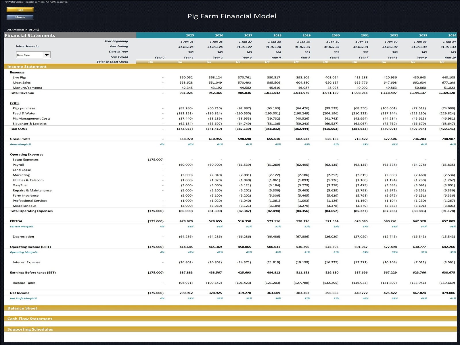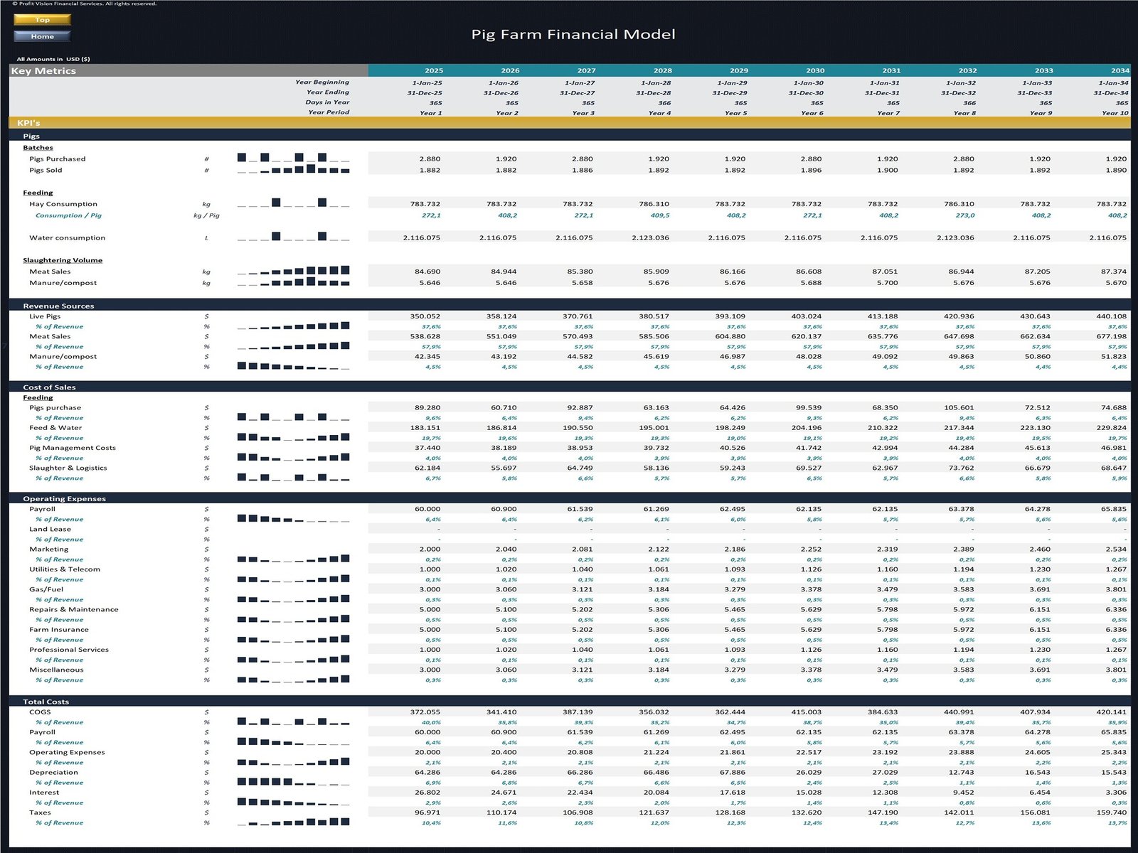 Financial model template presenting a development scenario of a Pig Farm, designed to help farmers plan, manage, and forecast their operations with precision. The model tracks key revenue drivers such as pig sales, breeding programs, and by-products, while detailing feed costs, veterinary expenses, labor, and facility maintenance.