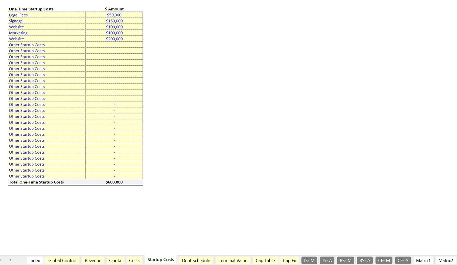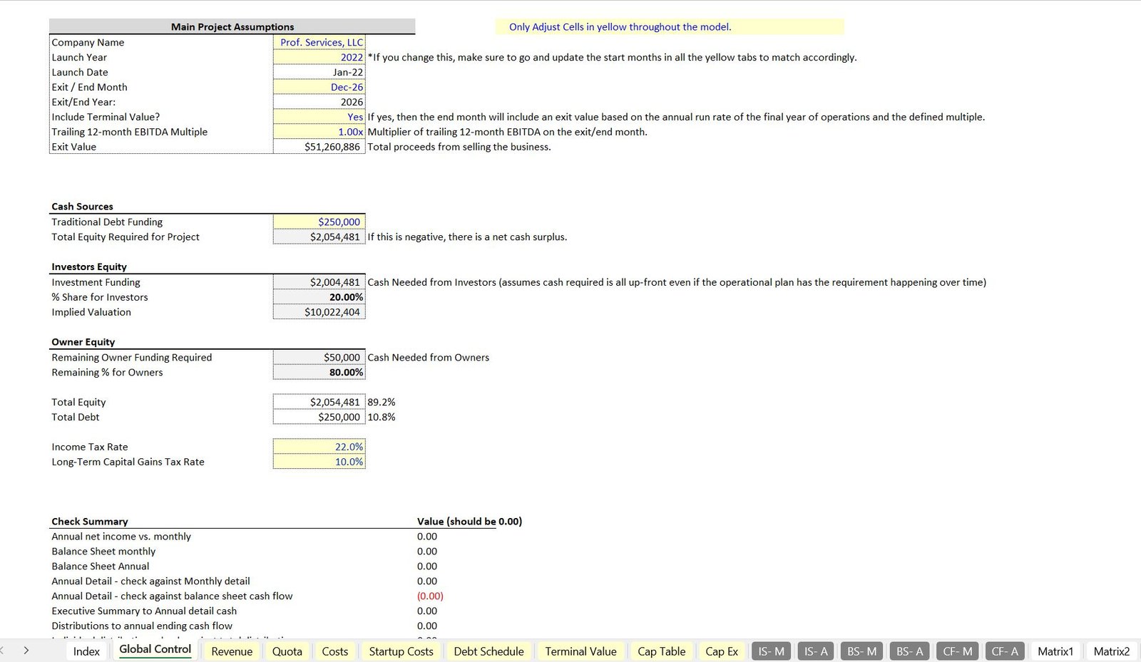 This tab also defines cash sources, including debt and equity, and ensures that the model calculates the remaining equity needed to maintain a zero or positive cash balance after accounting for startup costs and burn. Tax rates can be specified or set to zero if taxes are to be excluded.