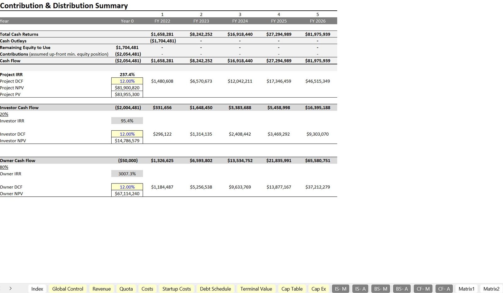 The Distributions Tab offers a detailed discounted cash flow (DCF) analysis, calculating: