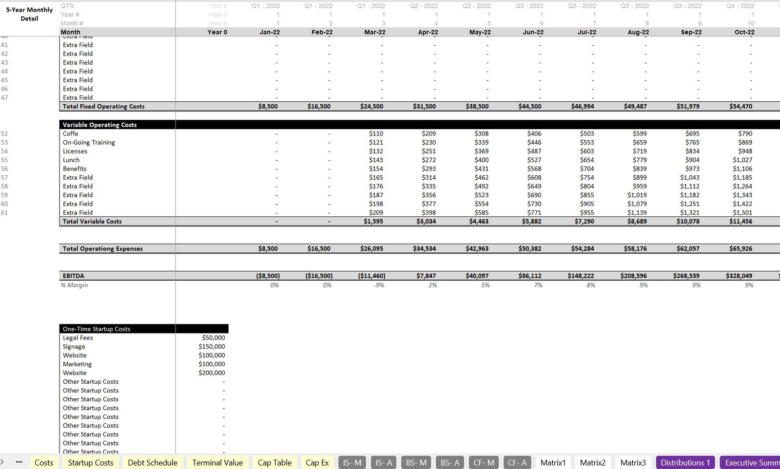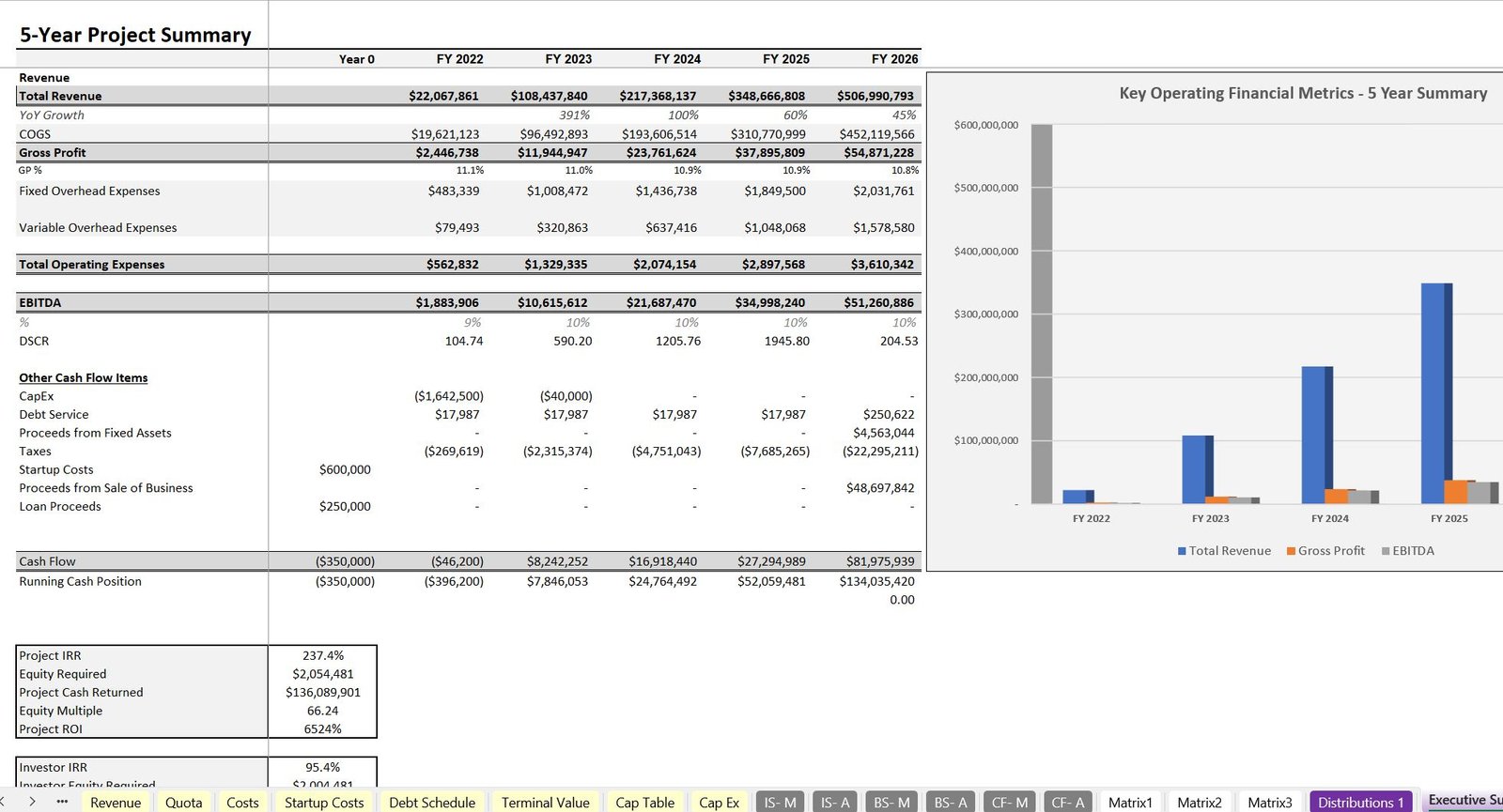 • Income Statement: Tracks revenue, cost of goods sold, operating expenses, EBITDA, and net income.