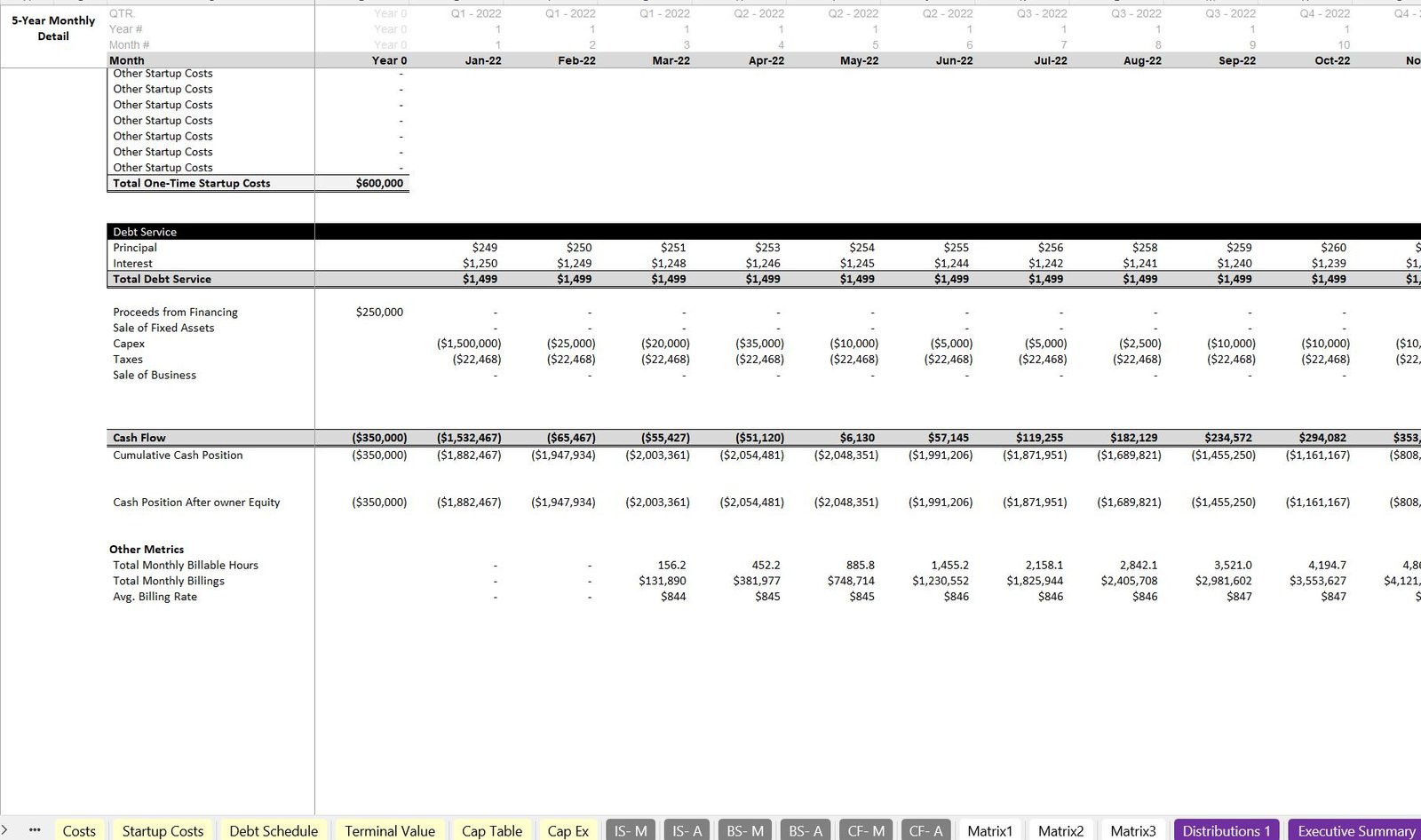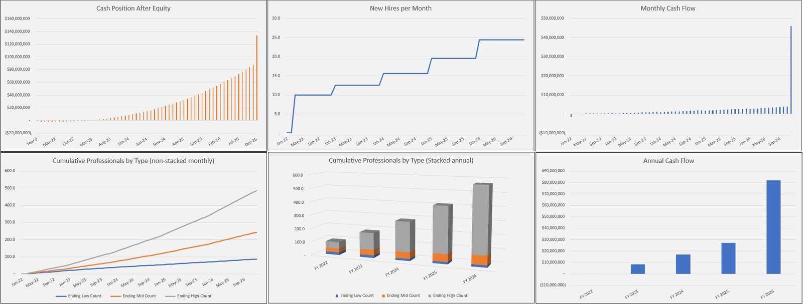 • Monthly Details Tab: Offers granular insights into all assumptions, showing how professional counts, revenues, and costs flow through the model on a monthly basis.