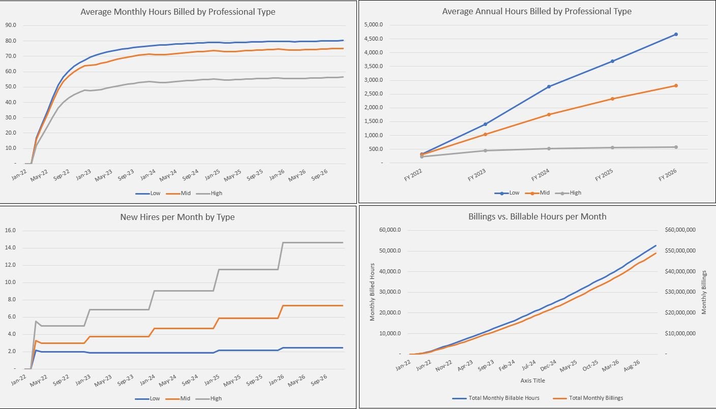 The model supports up to three professional types, each with unique billing rates, quotas, and percentages of billable revenue retained by the firm. Revenue is dynamically calculated based on the available hours and quota attainment for each type, adjusting over time.