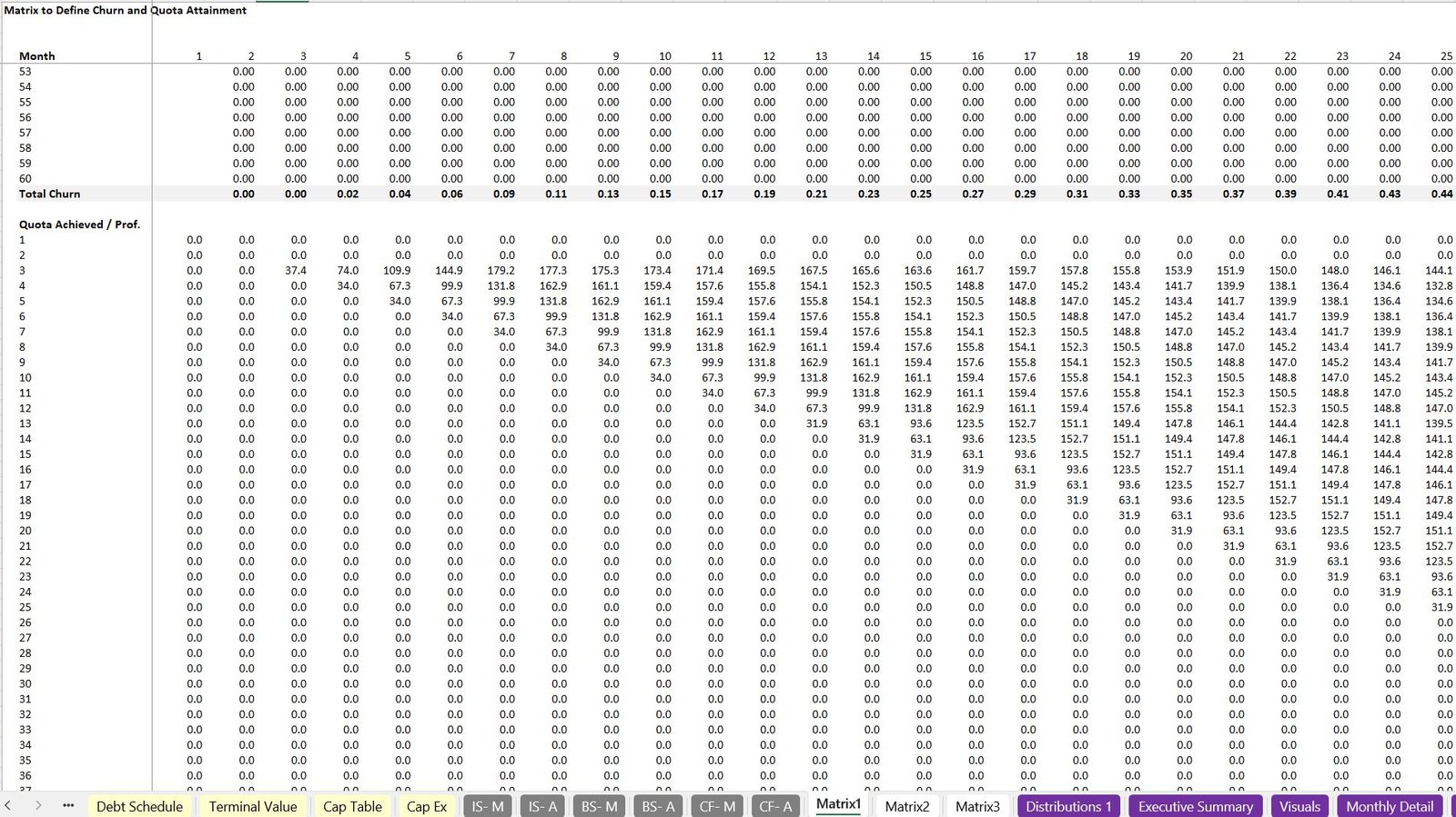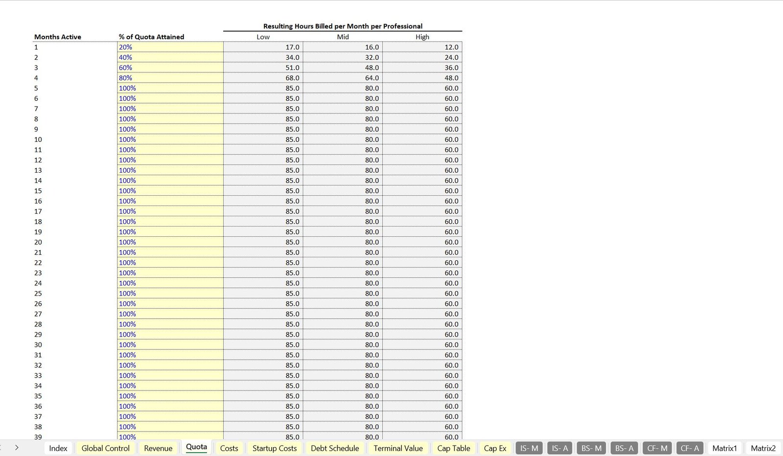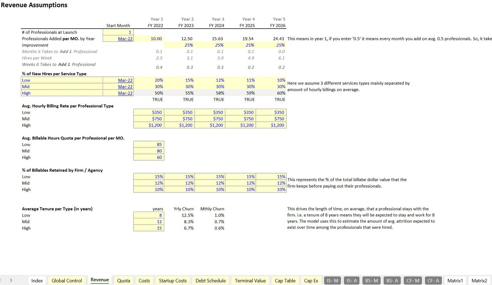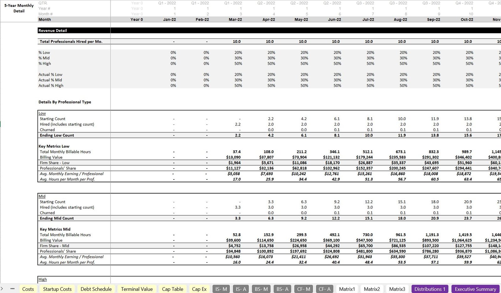 The Matrix Tabs dynamically calculate revenue based on professional types, billing rates, and tenure logic. These tabs integrate the inputs from the Revenue Tab and other assumptions, ensuring accurate projections.