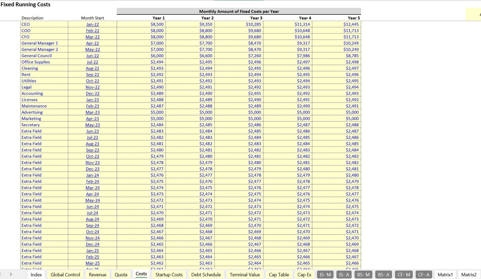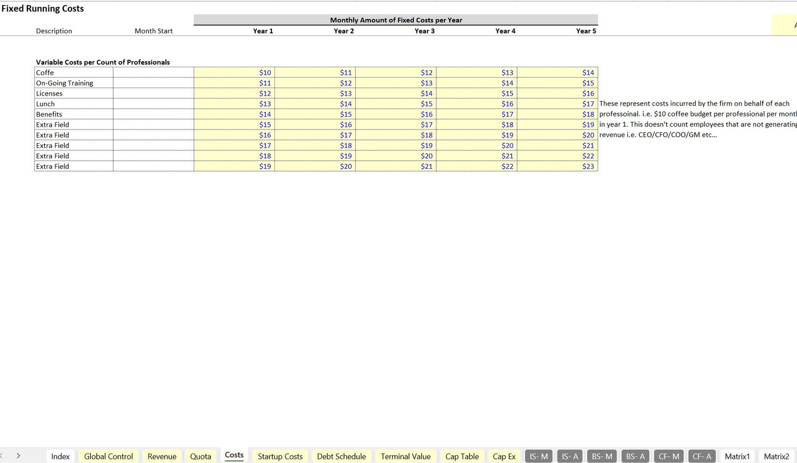 • Fixed Costs Tab: This includes expenses that do not change with the number of professionals or activity, such as: