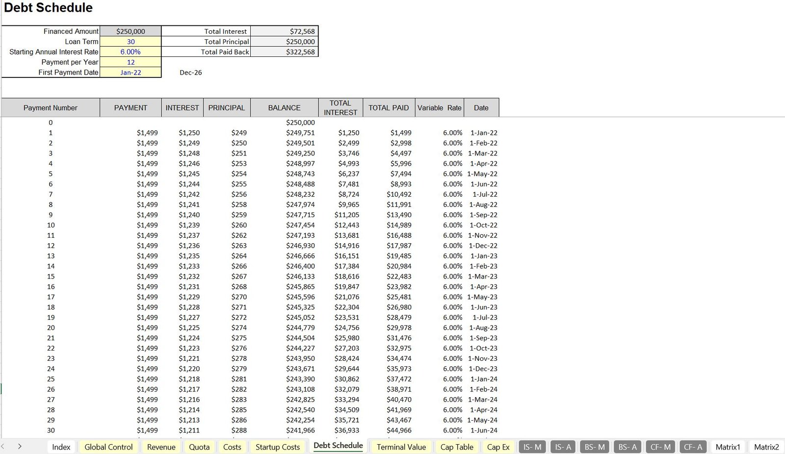 If a terminal value is included, the model assumes any outstanding loan principal is repaid in the exit month.