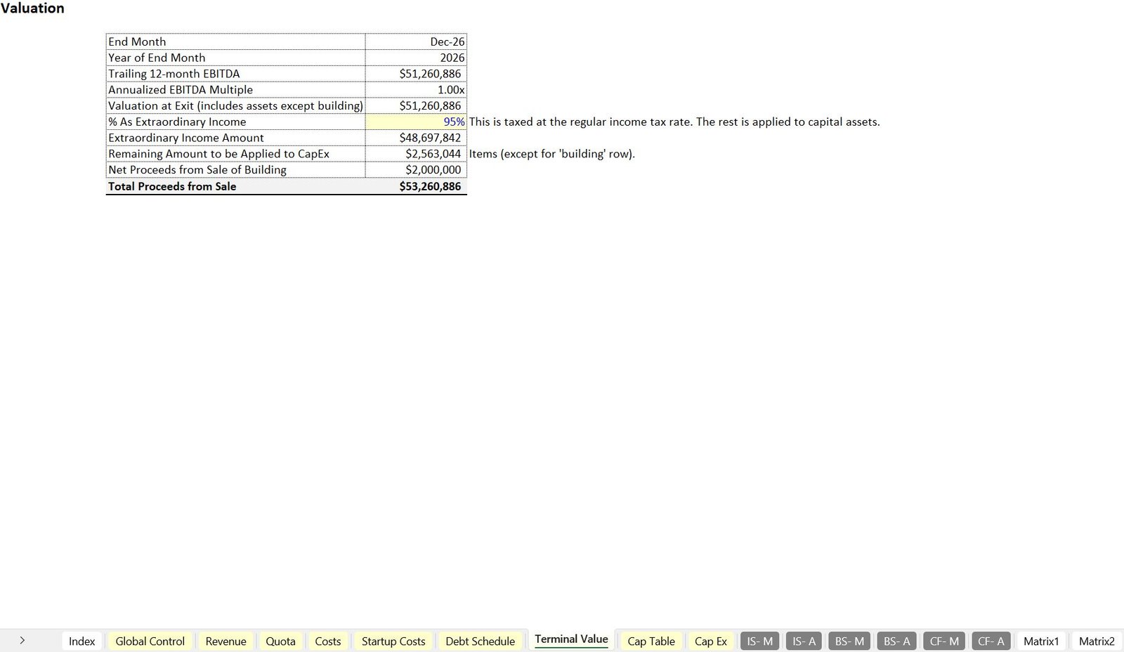 The Terminal Value Tab calculates a terminal value based on EBITDA and a selected multiple, with the option to adjust tax treatments for asset sales or extraordinary income.