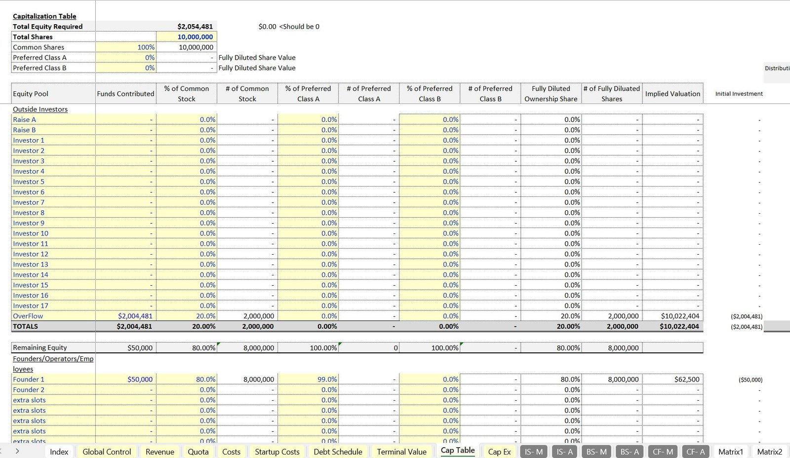 The Cap Table Tab supports up to 20 investors and 20 owners, allowing you to: