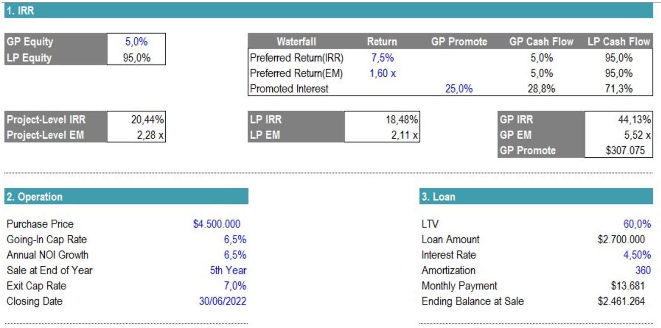 What sets our model apart is the exclusive consideration of both hurdles simultaneously. Unlike traditional models that solely focus on a single benchmark, our approach ensures that the General Partner’s extra promote interest is earned only when both the Preferred IRR and Equity Multiple targets are met. This unique feature elevates the precision of your analysis, making it an invaluable asset for assessing complex real estate investment opportunities.