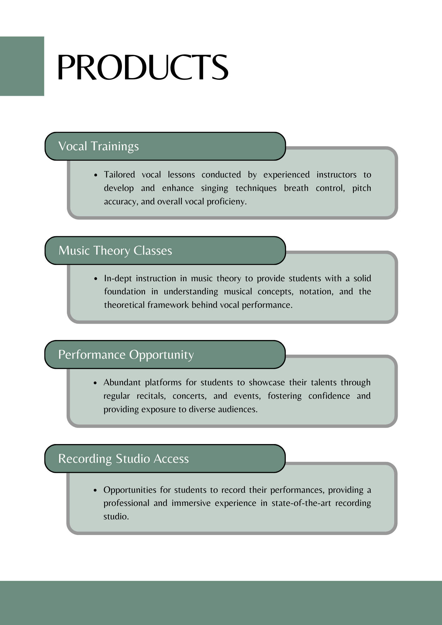 Products and Services: Outline offerings such as one-on-one Lessons, group classes, theory sessions, stage performance training, and studio workshops.