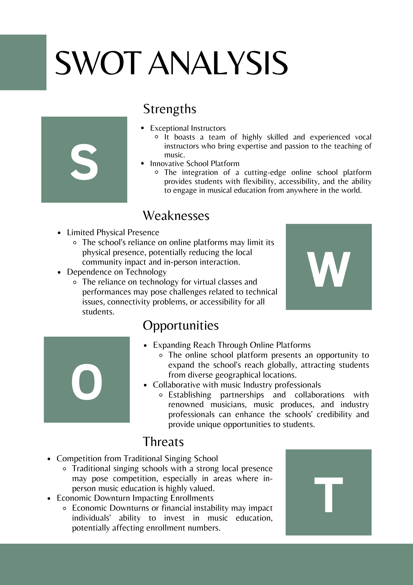 Competitor Analysis: Evaluate direct competitors (other singing or music schools) and indirect competitors (private teachers, arts organizations).
