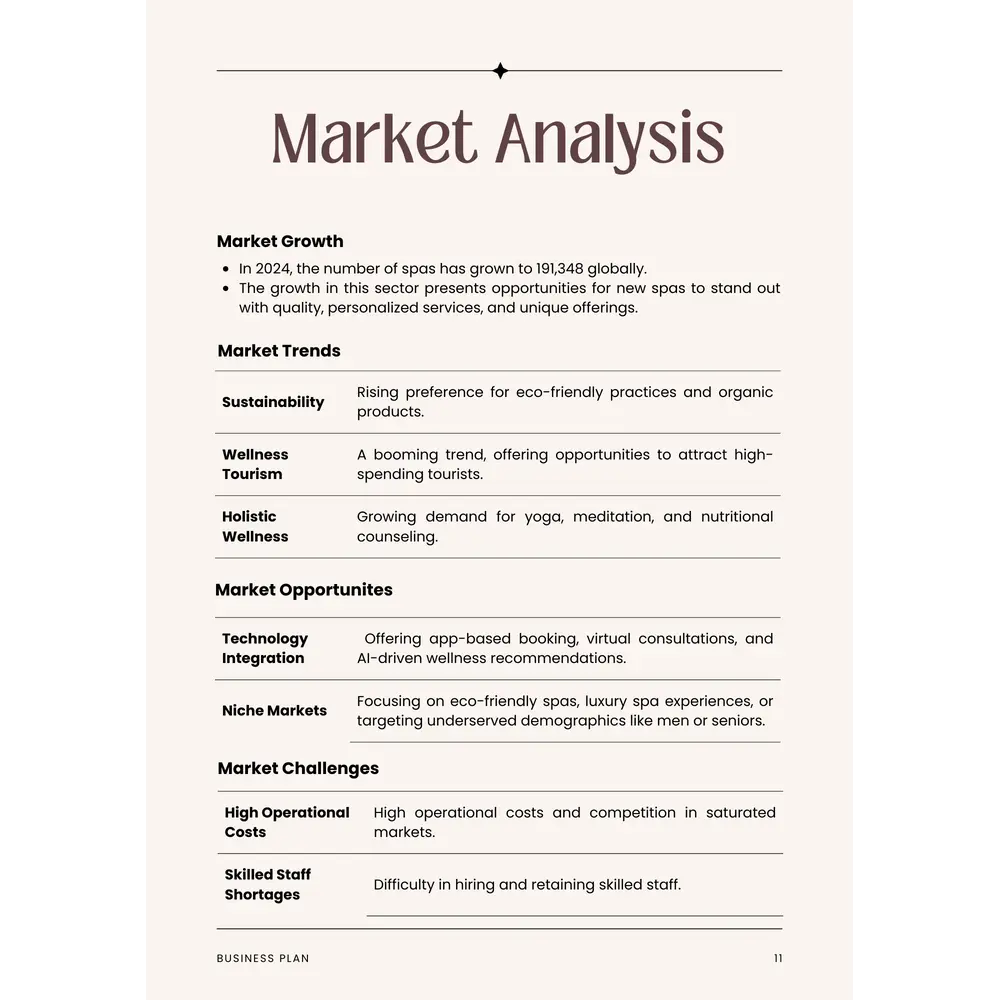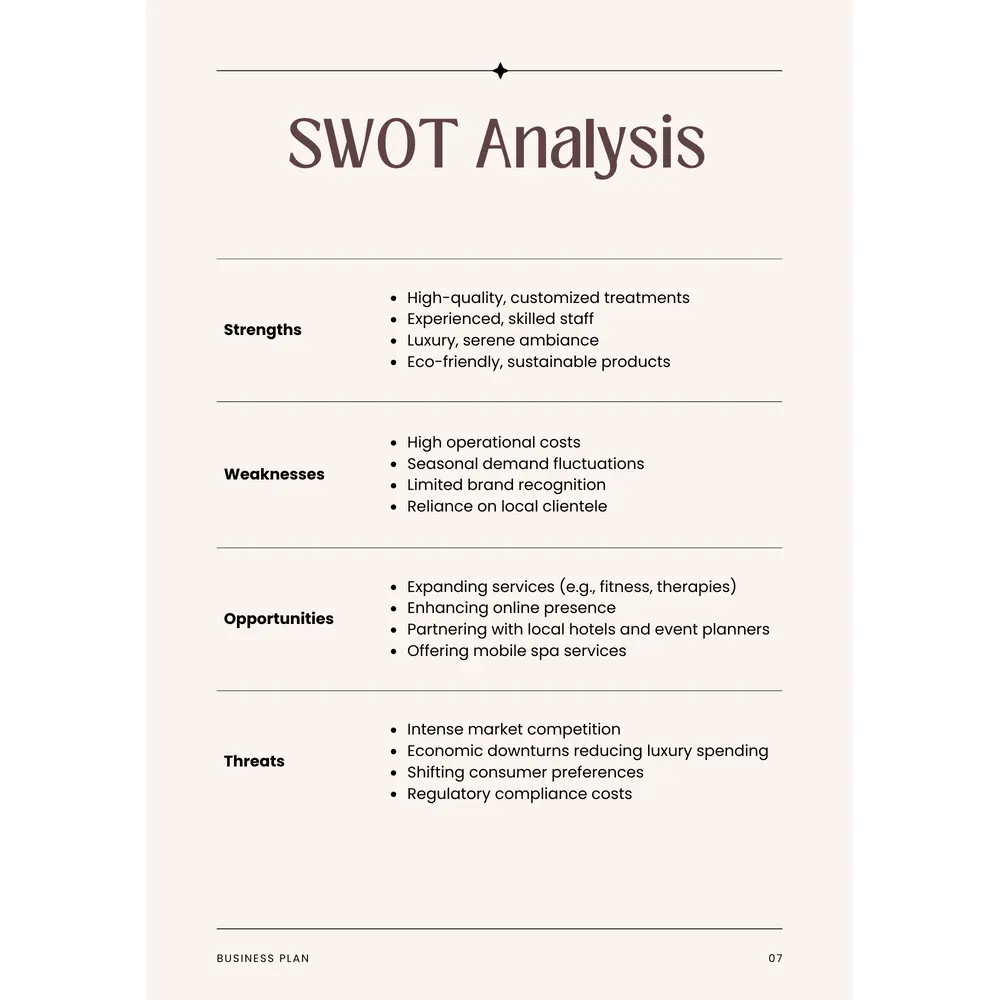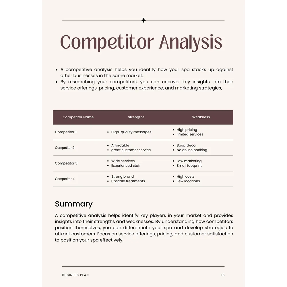 Identify your strengths, such as a serene ambiance and skilled staff, alongside potential weaknesses like seasonal demand. In addition, use the competitor matrix to analyze rival spas and position your services effectively.