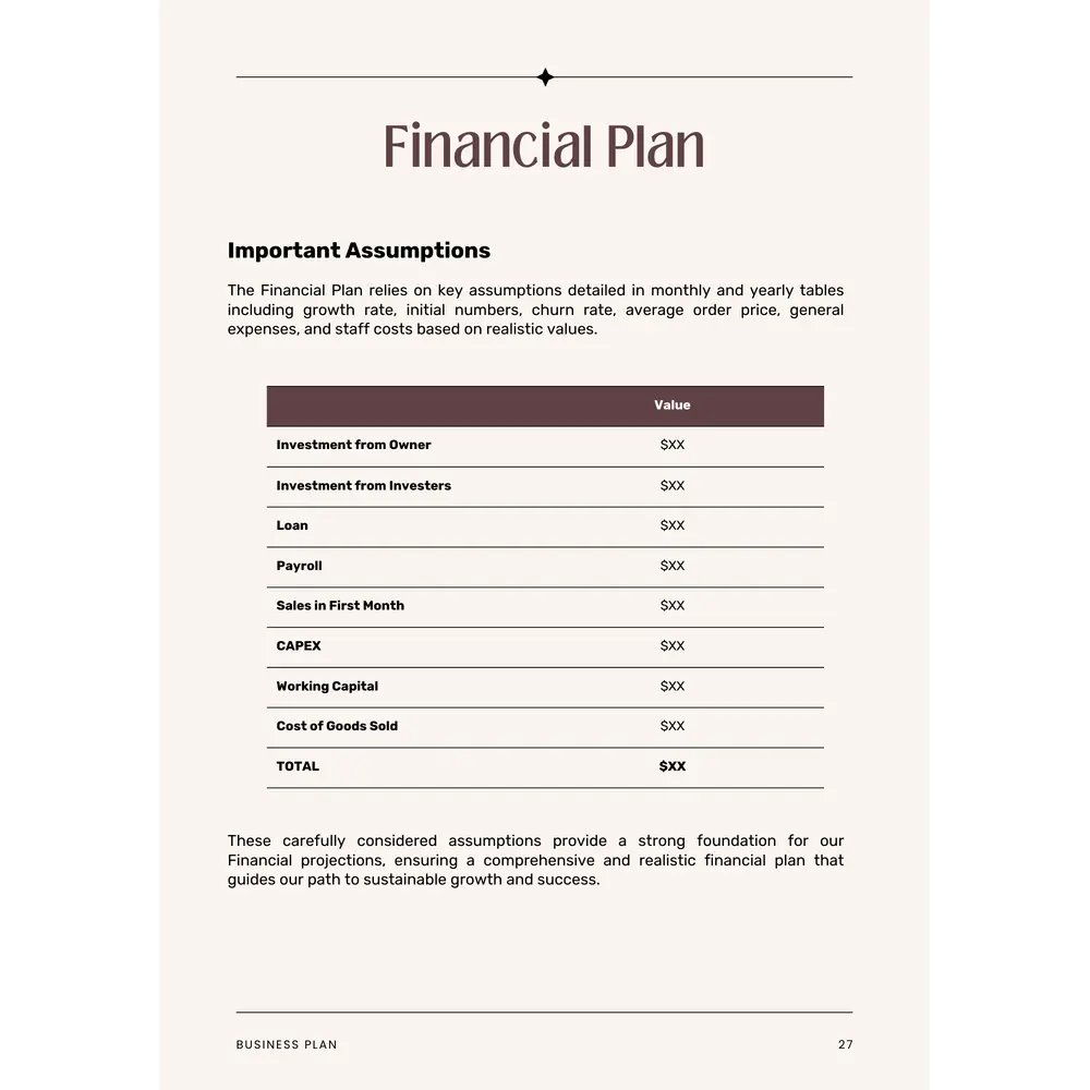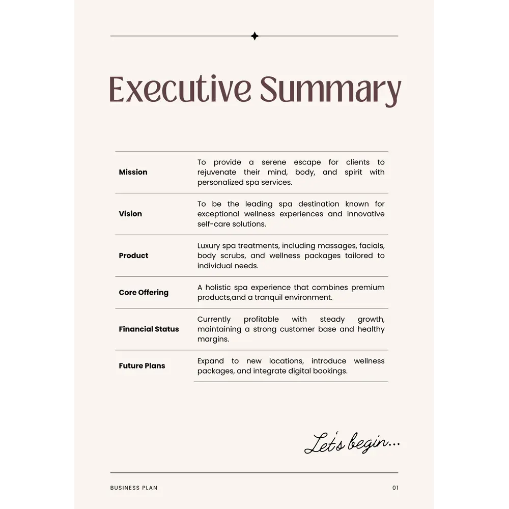 Start with a concise mission and vision statement. The template also provides a snapshot of your spa’s current performance and outlines achievable future goals, giving investors and stakeholders an immediate sense of direction.