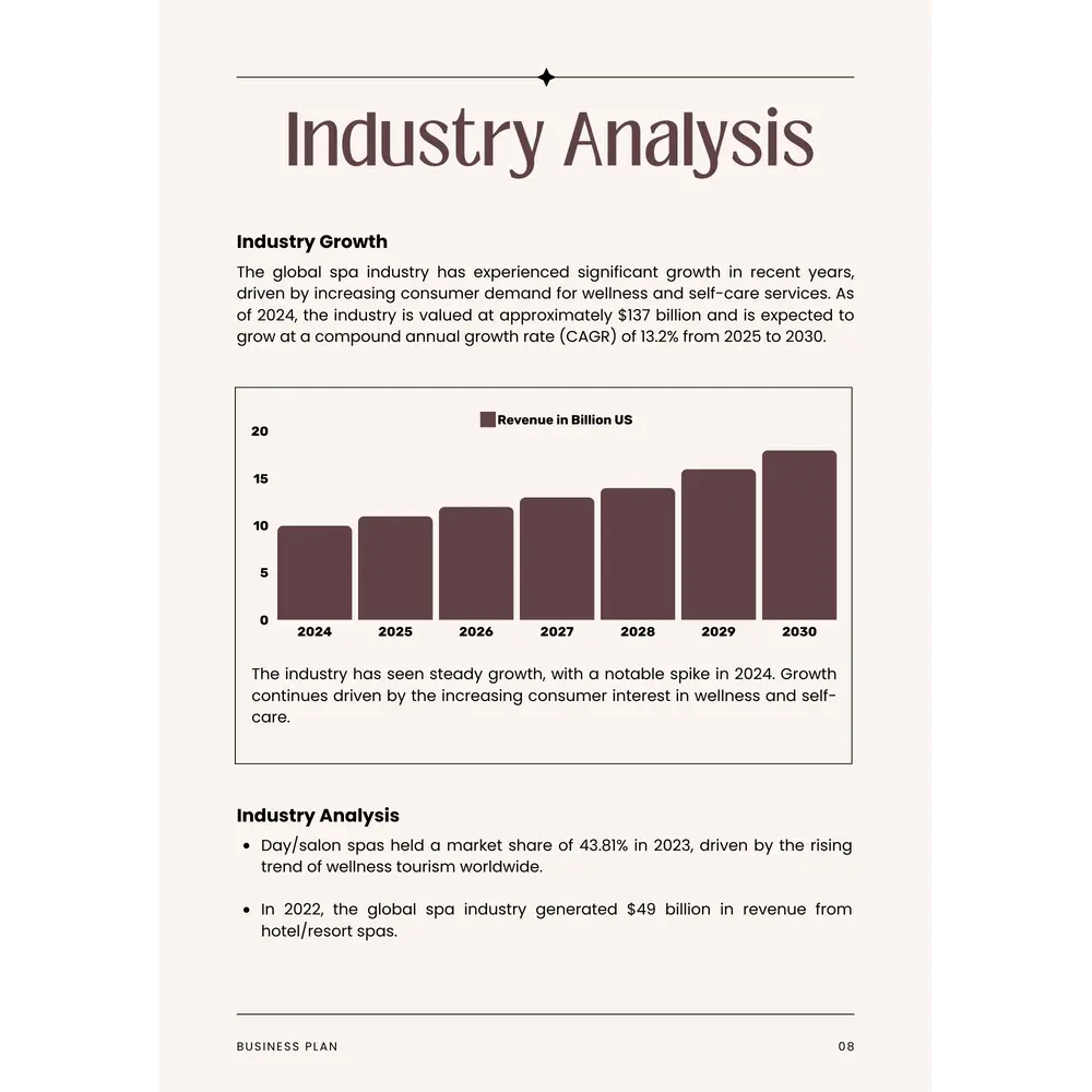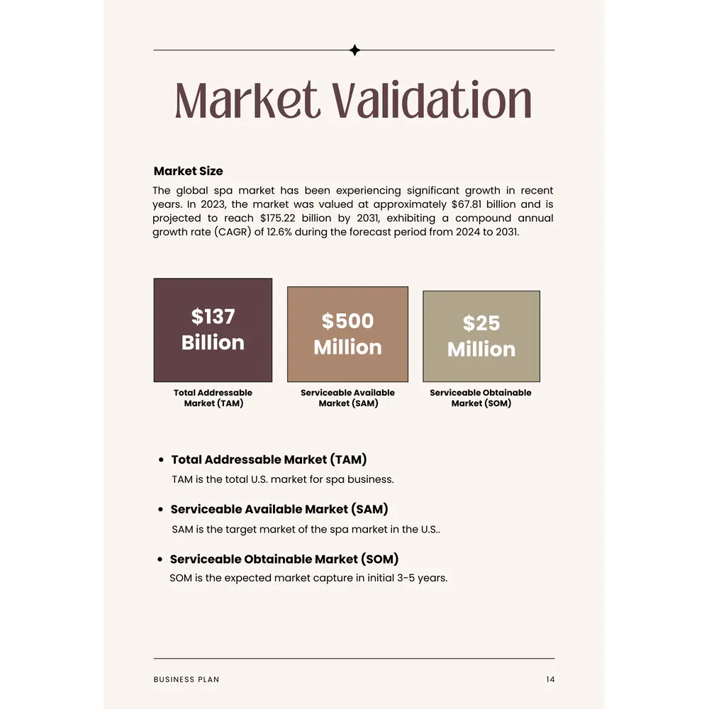 Leverage detailed market analysis and trends, including TAM/SAM/SOM visuals. This section validates demand for spa services and provides industry data that supports your growth assumptions.