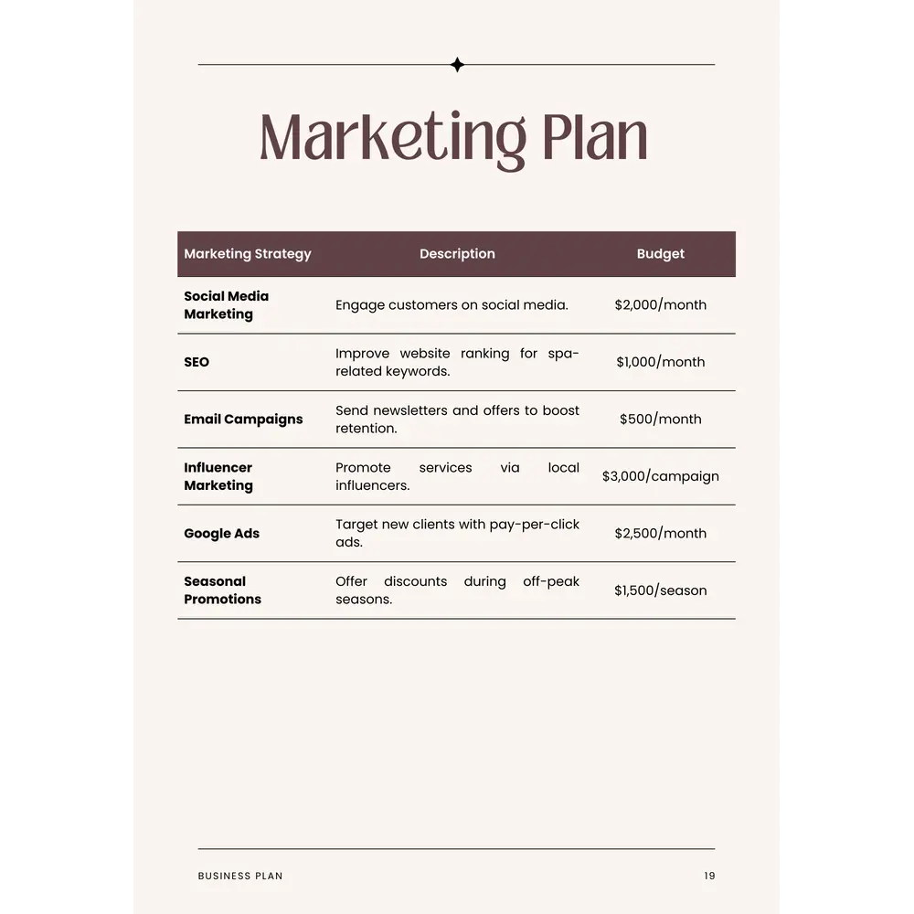 Plan how to attract and retain clients through social media, SEO, influencer partnerships, email campaigns, and seasonal promotions. For example, you might run Instagram ads for young professionals or collaborate with travel agencies to reach tourists.