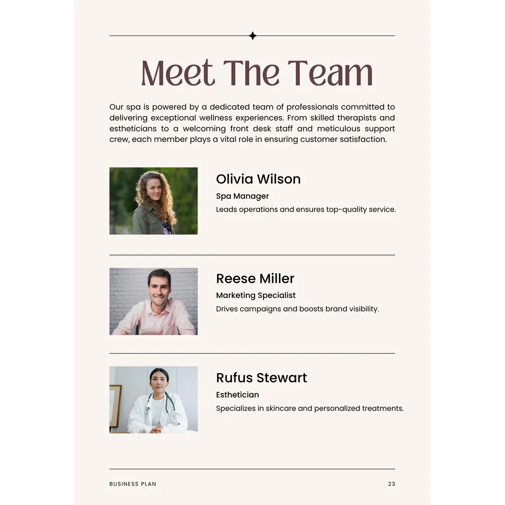 Highlight the roles of your team members, such as spa managers, estheticians, and marketing specialists. A simple org chart is included, making it easy to demonstrate clear responsibilities to staff and investors.