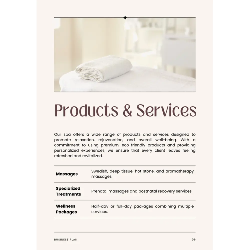 Set milestones for growth, including new locations, mobile spa services, luxury upgrades, and technology integration such as online bookings or virtual consultations. This roadmap shows how you will scale over time.